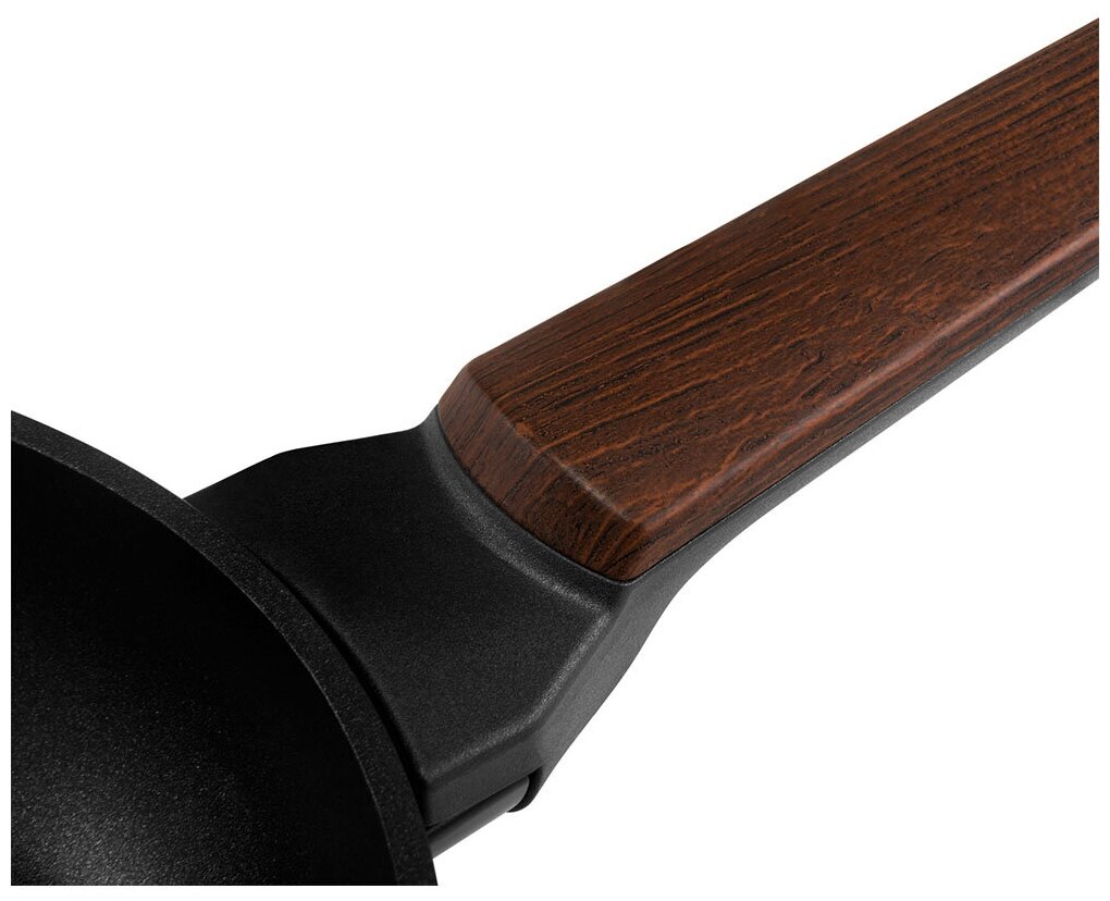 Сковорода изготовлена из высококачественного кованого алюминия толщиной 3.5 мм. Внутреннее высокопрочное утолщенное антипригарное покрытие Pfluon. Термостойкое внешнее покрытие. Эргономичная бакелитовая ручка с покрытием Soft Touch не нагревается и не скользит.