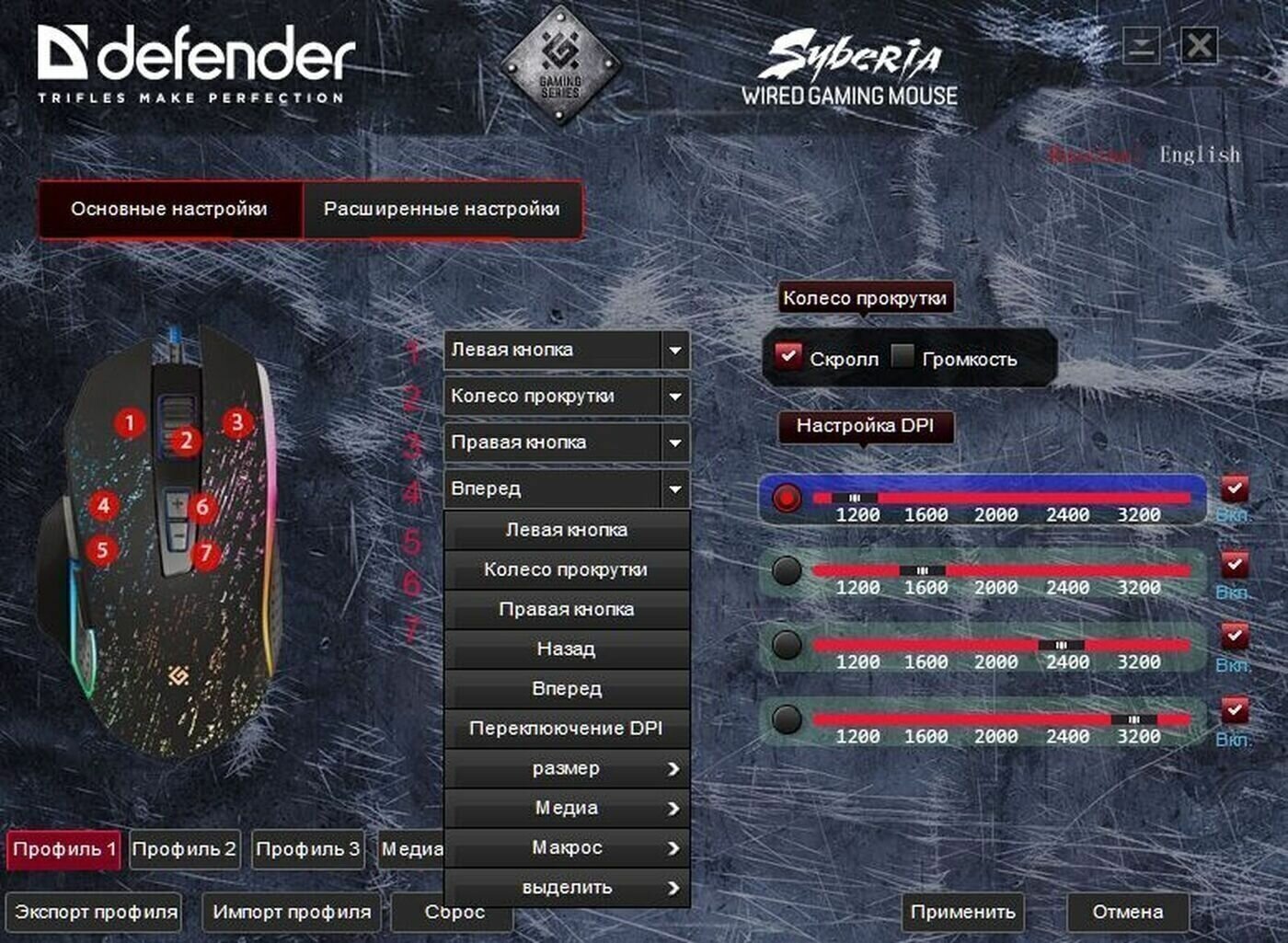 | Прочее | Стабильная работа на высоких скоростях, Сенсор обеспечивает скоростное, до 1 м/с, перемещение мыши по любой поверхности. Сенсор делает 4 000 снимков поверхности в секунду (4 000 FPS), что позволяет перемещать мышь с ускорением до 15 G (147 м/сек2)., Расширенная RGB-подсветка, Программное обеспечение Defender Game Center, Редактор макросов, Эмуляция клавиш клавиатуры, 4 режима разрешения мыши, Высокоточный сенсор, Широкое прорезиненное колесо прокрутки шириной 8 мм с подсветкой, 2 дополнительные боковые кнопки, Позолоченный USB-коннектор, Плетеная структура кабеля, Ферритовый фильтр помех, Переливающаяся подсветка, Прочное, приятное на ощупь прорезиненное покрытие, 5 программируемых кнопок, Кнопка выбора RGB подсветки |