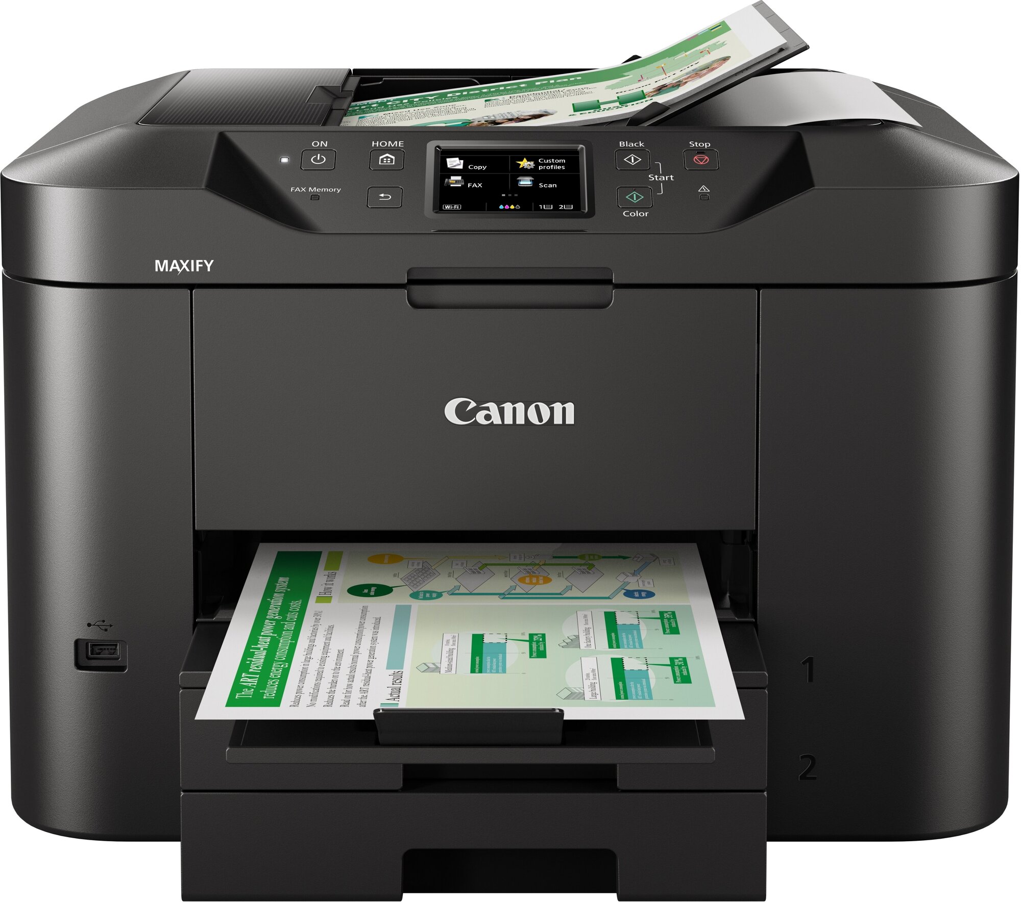 Настоящим чудом техники является МФУ струйное Canon MAXIFY , сочетающее принтер, факс, копир и сканер в едином корпусе. Особенность этого аппарата в поддержке печати с портативных устройств - планшетов и смартфонов - благодаря технологии AirPrint. Подключить МФУ к смартфону можно несколькими способами: посредством Wi-Fi, Ethernet или USB. На сенсорном дисплее отображаются необходимые для удобства работы сведения. Поддержка печати полноцветных фото позволяет Canon MAXIFY печатать на фотобумаге, матовой или глянцевой бумаге. В качестве носителя можно брать любые изделия для печати плотностью 64 - 275 г/м2