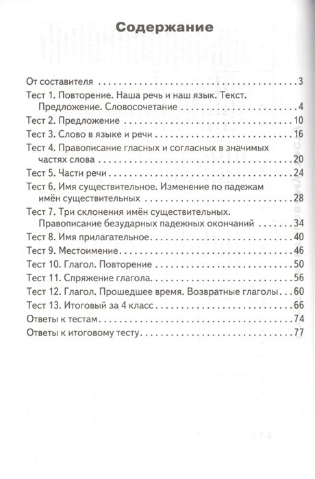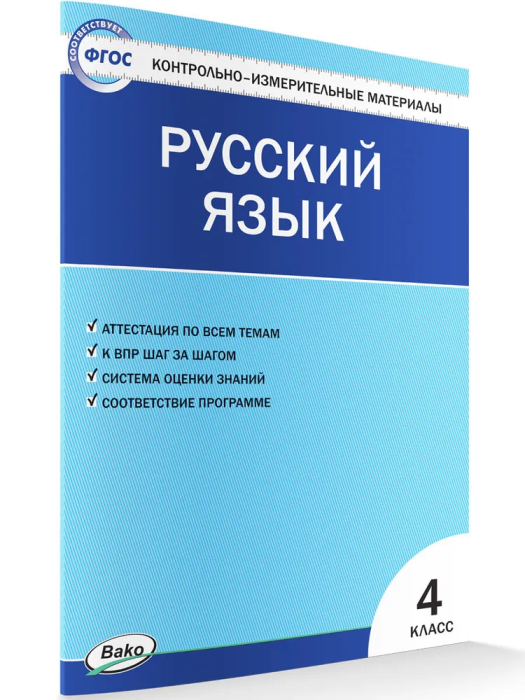 В пособии представлены контрольно-измерительные материалы по русскому языку для 4 класса, составленные в соответствии с требованиями ФГОС НОО и с учётом примерной программы начального общего образования по русскому языку. В конце пособия ко всем заданиям приведены ответы.