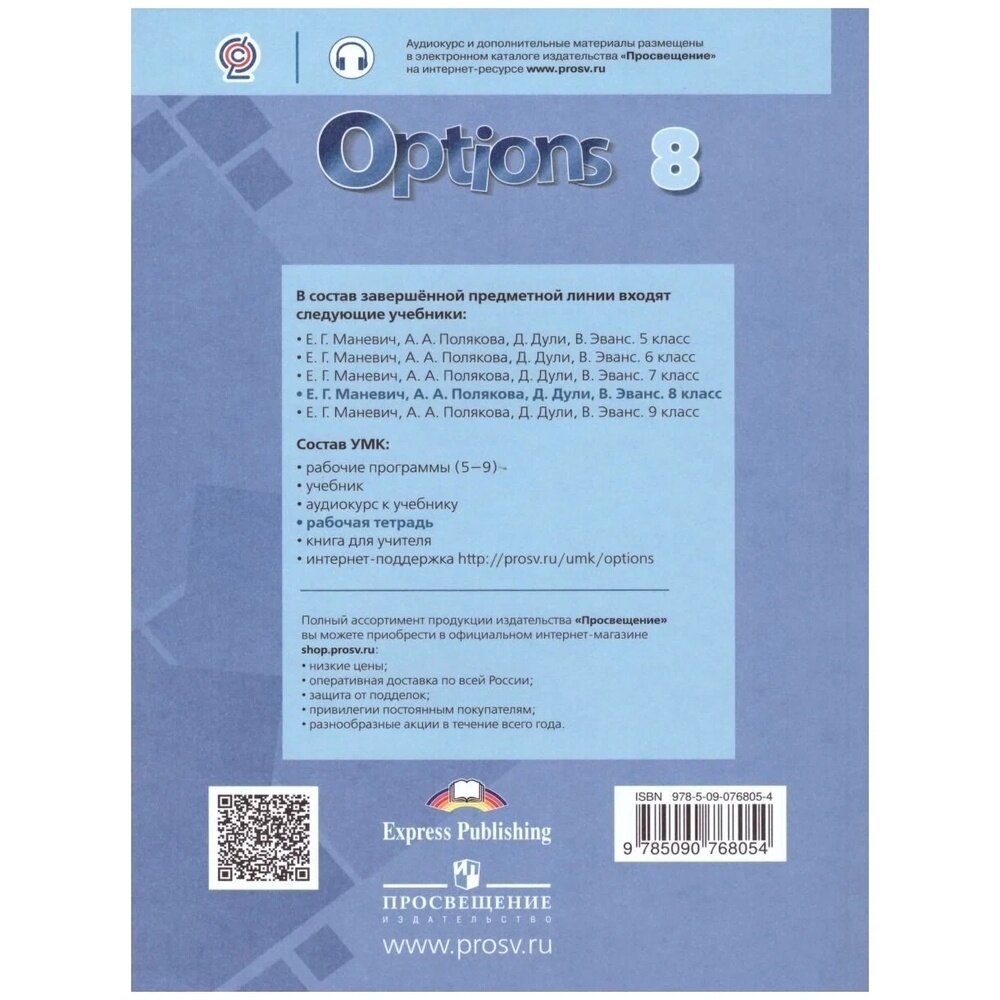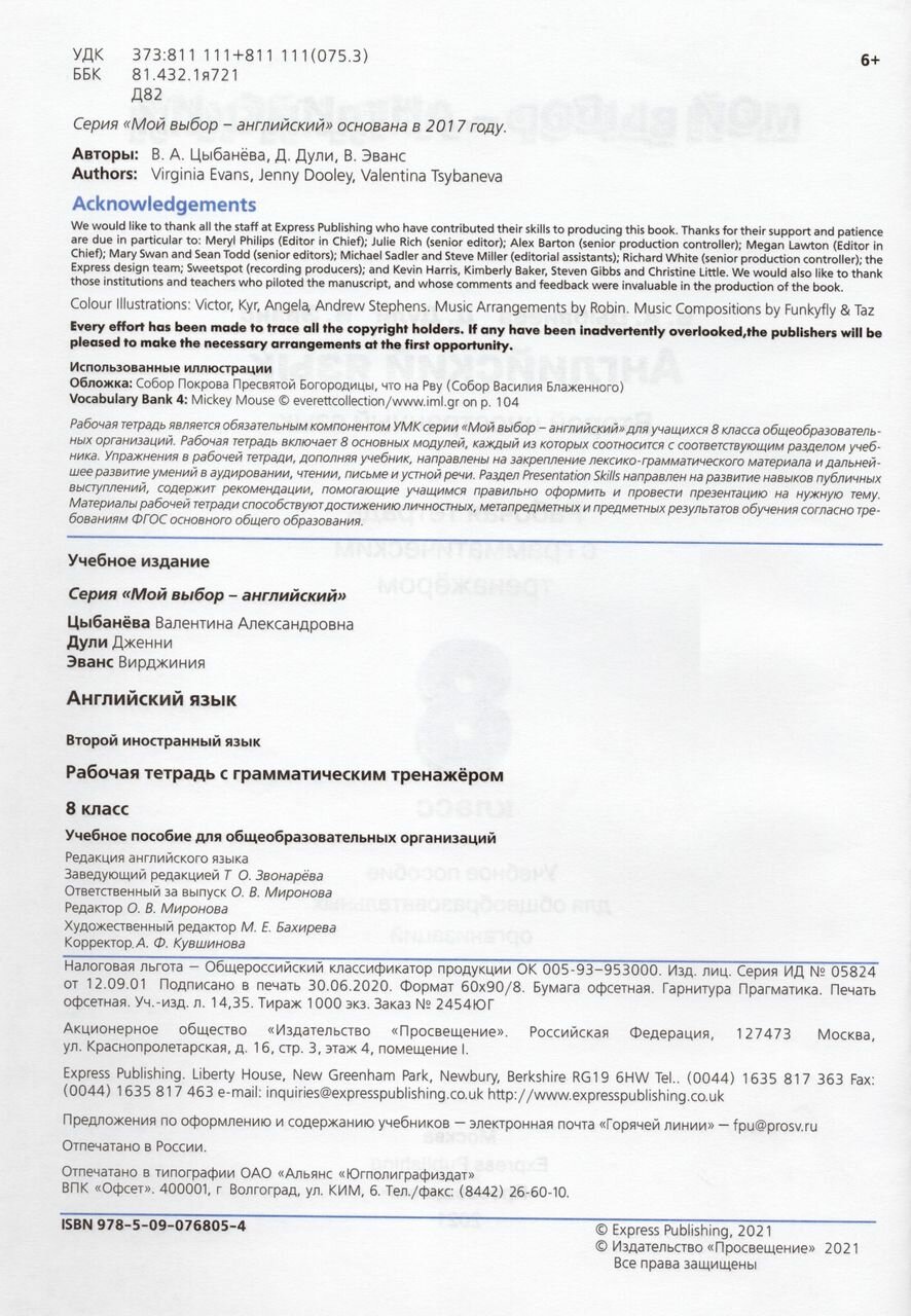 Рабочая тетрадь является обязательным компонентом УМК серии "Мой выбор - английский" для учащихся 8 класса общеобразовательных организаций. Рабочая тетрадь включает 8 основных модулей, каждый из которых соотносится с соответствующим разделом учебника. Упражнения в рабочей тетради, дополняя учебник, направлены на закрепление лексико-грамматического материала и дальнейшее развитие умений в аудировании, чтении, письме и устной речи. Раздел Presentation Skills направлен на развитие навыков публичных выступлений, содержит рекомендации, помогающие учащимся правильно оформить и провести презентацию на нужную тему. Материалы рабочей тетради способствуют достижению личностных, метапредметных и предметных результатов обучения согласно требованиям ФГОС основного общего образования.