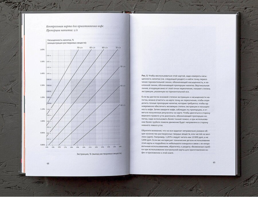 В книге грамотное начало – с курса про экстракцию кофе, подробно описаны факторы, влияющие на нее и советы, как ее ускорить, к примеру. Далее автор пишет о помоле и уже потом о методах альтернативного заваривания. В конце книги главы о хранении кофе и воде.