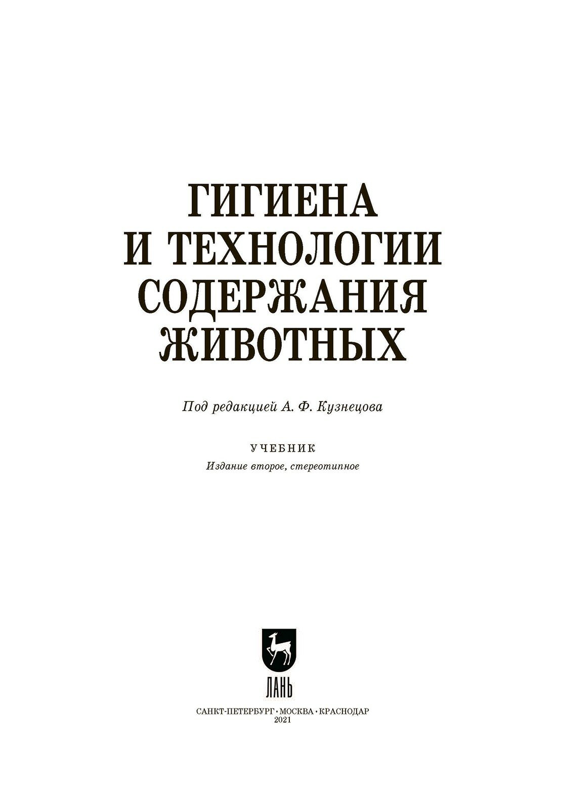 Гигиена и технологии содержания животных.Уч.СПО (Кузнецов Анатолий Федорович, Тюрин Владимир Григорьевич, Семенов Владимир Григорьевич); Лань, 2021