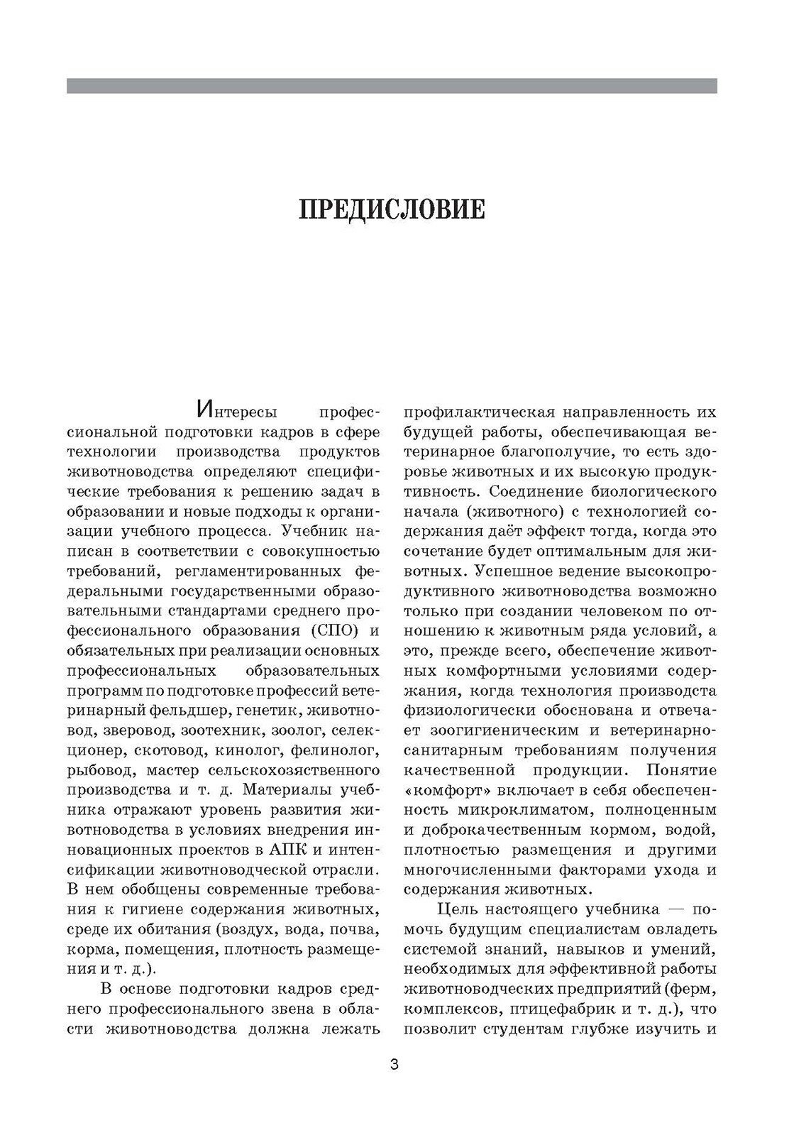 Учебник предназначен для студентов, получающих среднее профессиональное образование (СПО) в области животноводства, ветеринарии, зоотехнии и других смежных направлений. Учебник включает 18 глав. В I части "Общая гигиена" (8 глав) освещены следующие вопросы: гигиена воздушной среды, почва и ее санитарное значение, вода и поение животных, корма и кормление животных, основы проектирования и строительства животноводческих объектов, транспортировка животных, гигиена ухода за животными и ветеринарная защита ферм. Во II части (10 глав) представлен материал по гигиене и технологиям содержания, включая выращивание новорожденных животных, разных половозрастных и производственных групп следующих видов животных: крупный рогатый скот, свиньи, лошади, овцы, козы, сельскохозяйственная птица, пушные звери и кролики, товарное рыбоводство, пчелы, лабораторнрные животные. Материалы практикума отражают уровень развития животноводства в условиях внедрения инновационных проектов в АПК и интенсификации животноводческой отрасли. В нем обобщены современные требования к гигиене и технологиям содержания животных, среде их обитания. В содержание учебника включены нормативно-правовые документы: ГОСТ, ТУ, ветеринарно-санитарные правила и нормы (Вет-санПиН), санитарные правила и нормы (СанПиН), нормы технологического проектирования (НТП-АПК), рекомендательные документы (РД-АПК) и др.