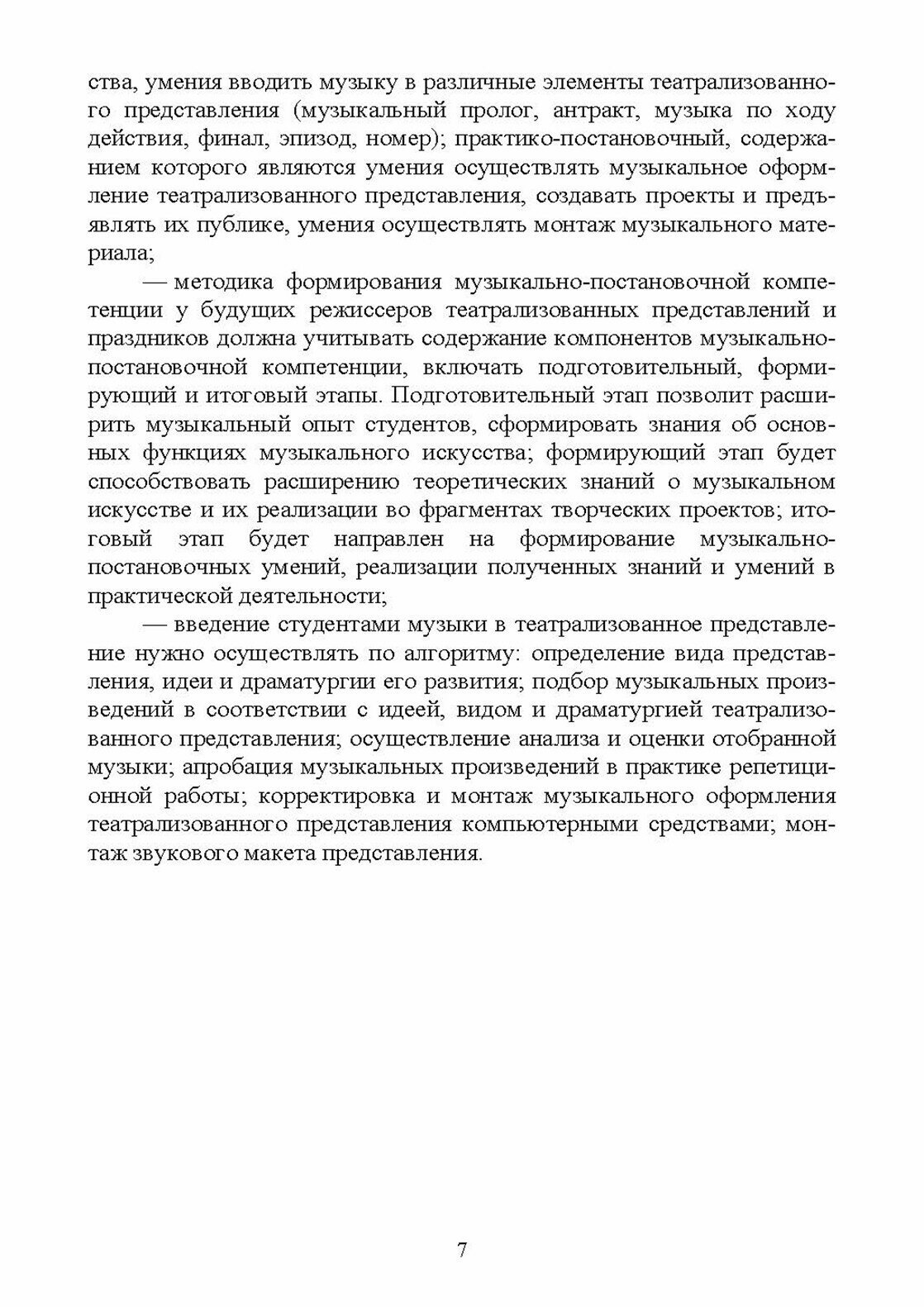 В пособии определено содержание музыкально-постановочной компетенции, ее компонентов, разработана методика формирования музыкально-постановочной компетенции у будущих режиссеров театрализованных представлений и праздников, которая строится поэтапно и учитывает содержание компонентов музыкально-постановочной компетенции, а также предложена оригинальная трактовка синтонности, как основополагающего педагогического принципа в процессе обучения режиссеров. Практические результаты работы могут быть востребованы в процессе профессиональной подготовки будущих режиссеров театрализованных представлений и праздников в вузах культуры и искусств.