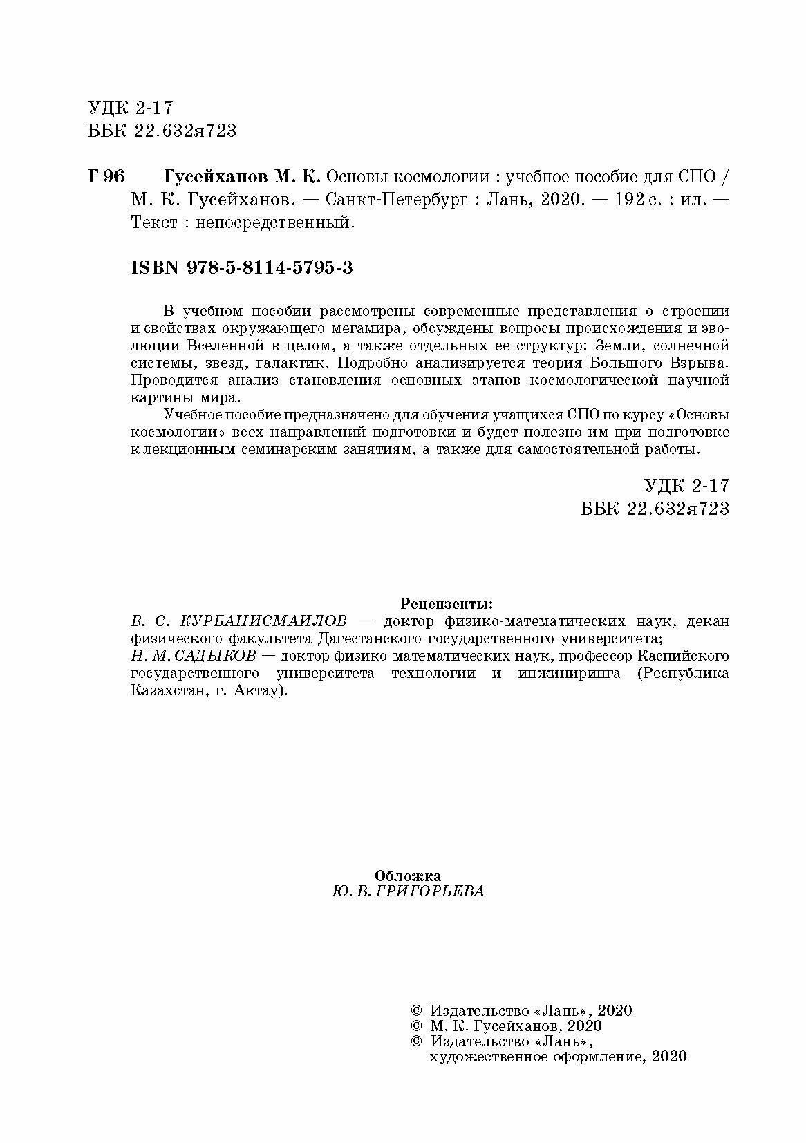Основы космологии.Уч.пос.СПО (Магомедбаг Кагирович Гусейханов); Издательство ЛАНЬ, 2020