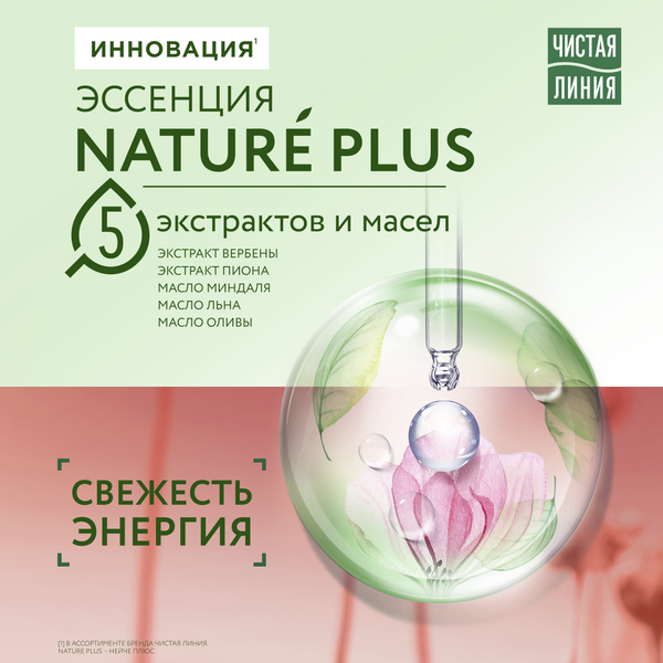 97 % компонентов натурального происхождения. Экстракт шиповника тонизирует, способствует обновлению кожи, придаёт сияние. Одобрено дерматологами. Эссенция Nature Plus 5 экстрактов и масел: экстракт вербены, экстракт пиона, масла миндаля, льна, оливы.