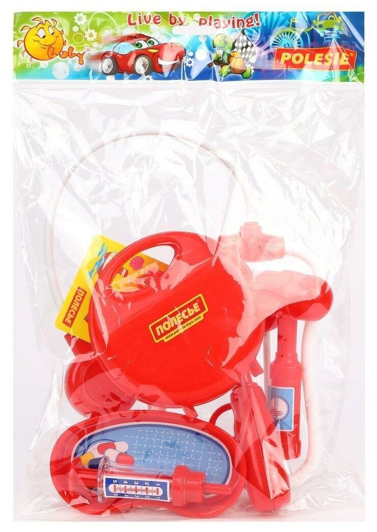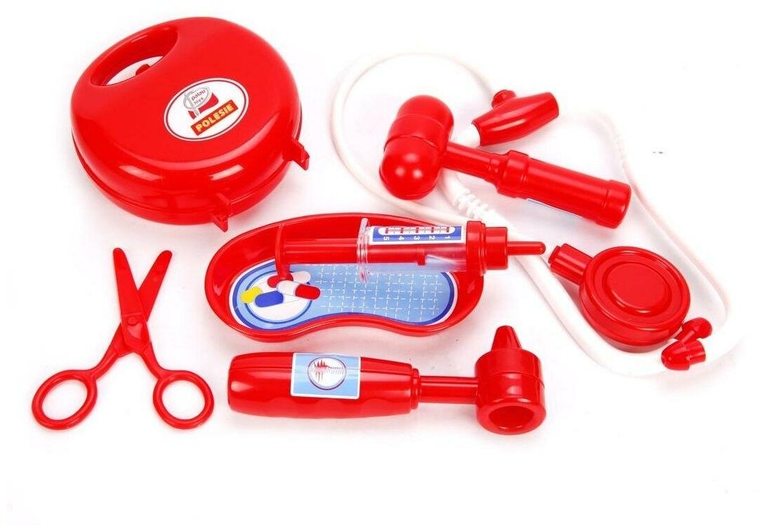 Полесье может стать подарком для ребенка. Использовать его можно как целиком (например, при игре в доктора), так и по частям. Пригодится он для лечения кукол, или даже - живых пациентов в процессе различных сюжетно-ролевых игр. Используя комплектующие данного набора можно делать уколы, слушать сердце, и так далее. В составе набора: ножницы - 1 шт., шприц - 1 шт., лоток для инструментов стетоскоп (для выслушивания сердца и лёгких) - 1 шт., отоскоп (инструмент лор-врача) - 1 шт., молоточек - 1 шт., медицинский чемоданчик - 1 шт.