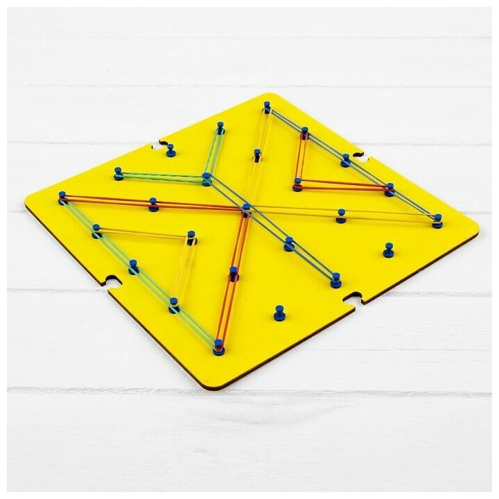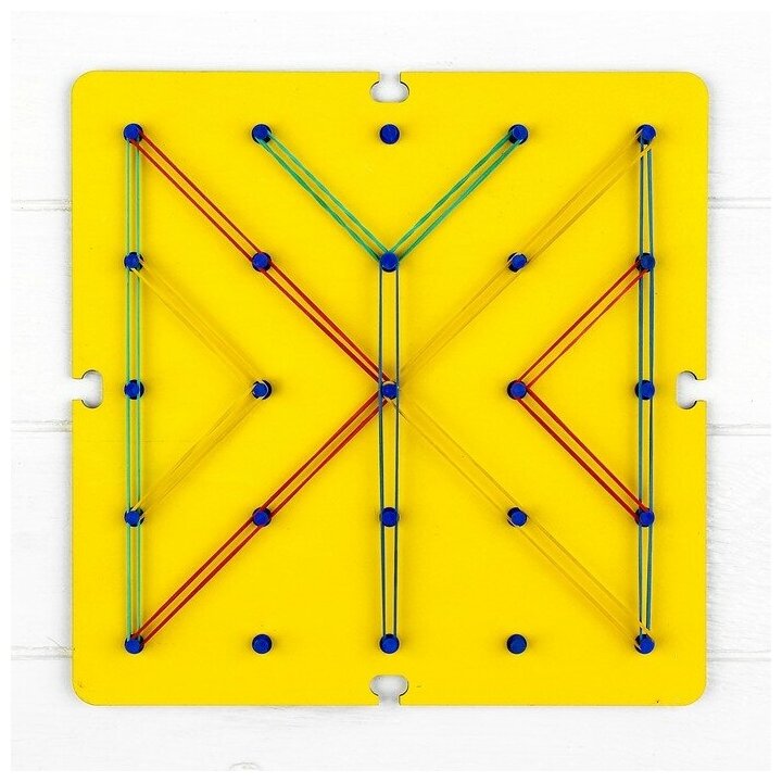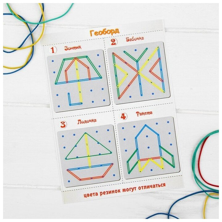 Геоборд – это игрушка для познавательно-математического развития ребенка. Геоборд представляет собой красочное поле с тематическим орнаментом, на котором расположено 25 штырьков (5 рядов и 5 столбцов), набор цветных резинок, схемы сборки. Задача ребенка на штырьки натягивать резинки для получения всевозможных силуэтных изображений – букв, цифр, геометрических фигур, сюжетных картинок. Ребенок может повторить готовую схему или придумать свое собственное изображение. Игры с Геобордом развивают логическое мышление, память, воображение, моторику рук, координацию движения, зрительное и тактильное восприятие. Геоборд станет незаменимым помощником в формировании математических представлений, а также подарит ребенку массу положительных эмоций и займет его на продолжительное время.