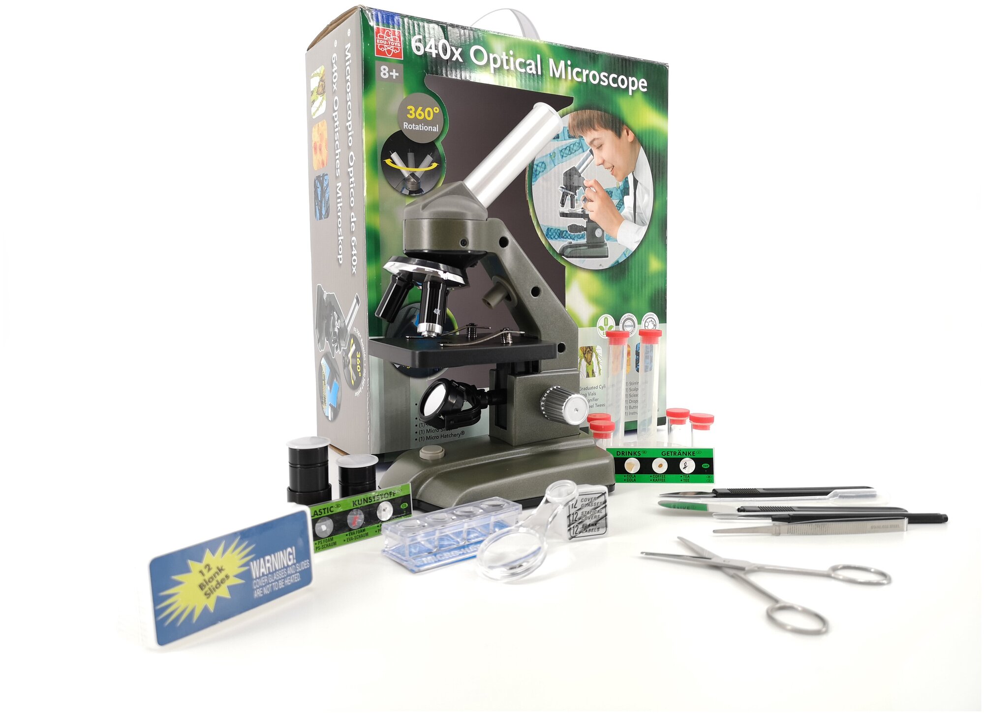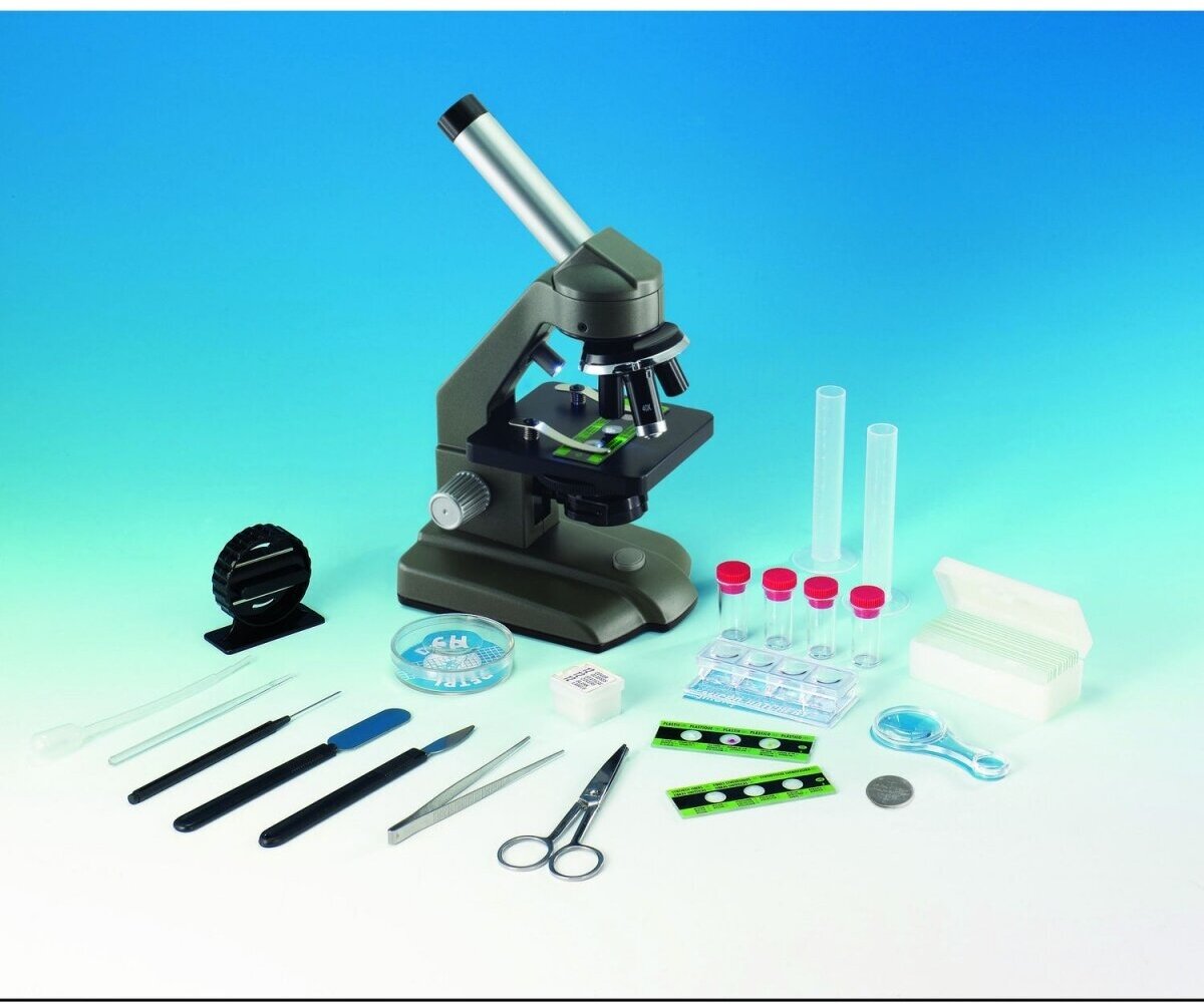 | Состав набора | окуляры 10x и 25x, 6 слайдов с образцами, 12 пустых слайдов для образцов, 1 чашка Петри, 1 медицинское шило, 1 скребок, 1 пипетка пластиковая, 1 пинцет, 1 медицинская лопатка, 1 стеклянная палочка для смешивания, 4 маленькие пробирки, 2 большие пробирки, 12 подложек из слюды и 12 наклеек для слайдов, инструкция по использованию |