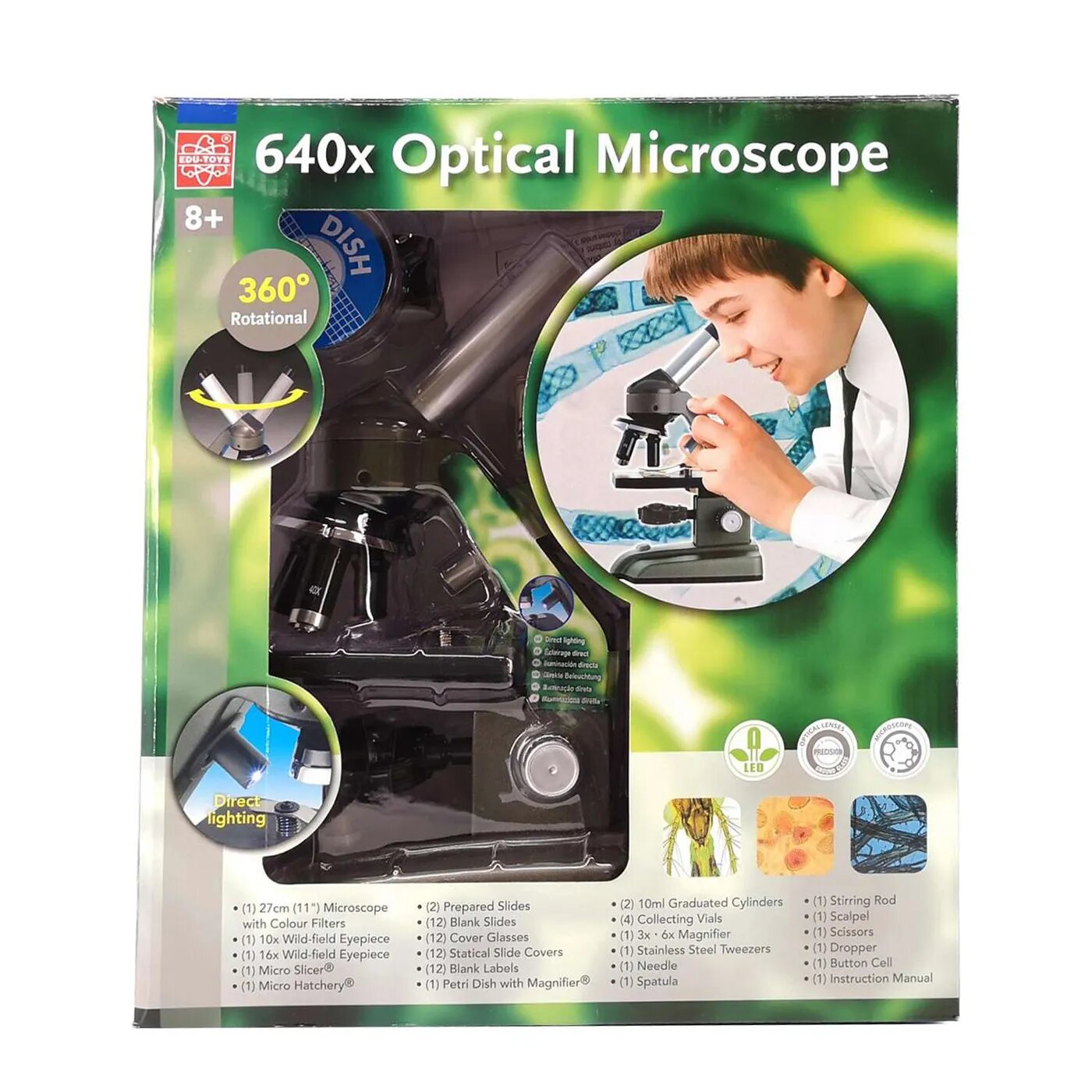 С помощью этого микроскопа с 640-кратным увеличением, маленький исследователь получит множество ярких впечатлений, познакомившись с прекрасным и удивительным микромиром, узнает, как устроены привычные предметы, выяснит, из чего состоят растения и насекомые.В комплекте:— Окуляры 10x и 25x — 6 слайдов с образцами— 12 пустых слайдов для образцов — 1 чашка Петри — 1 медицинское шило— 1 скребок— 1 пипетка пластиковая — 1 пинцет — 1 медицинская лопатка— 1 стеклянная палочка для смешивания — 4 маленькие пробирки — 2 большие пробирки— 12 подложек из слюды и 12 наклеек для слайдов— Инструкция по использованиюТребуется 3 батарейки типа AA (батарейки не входят в комплект)Требуется 1 батарейка типа CR2032 (батарейка входит в комплект)