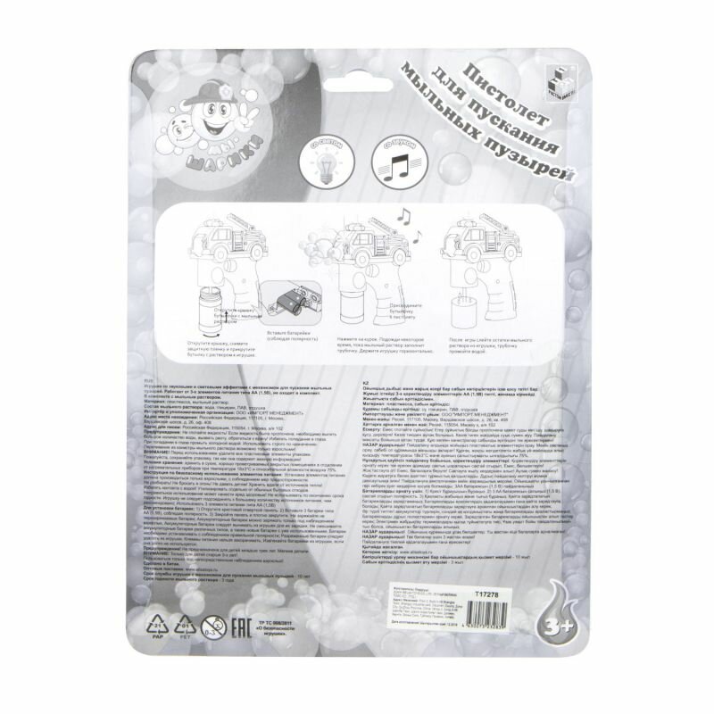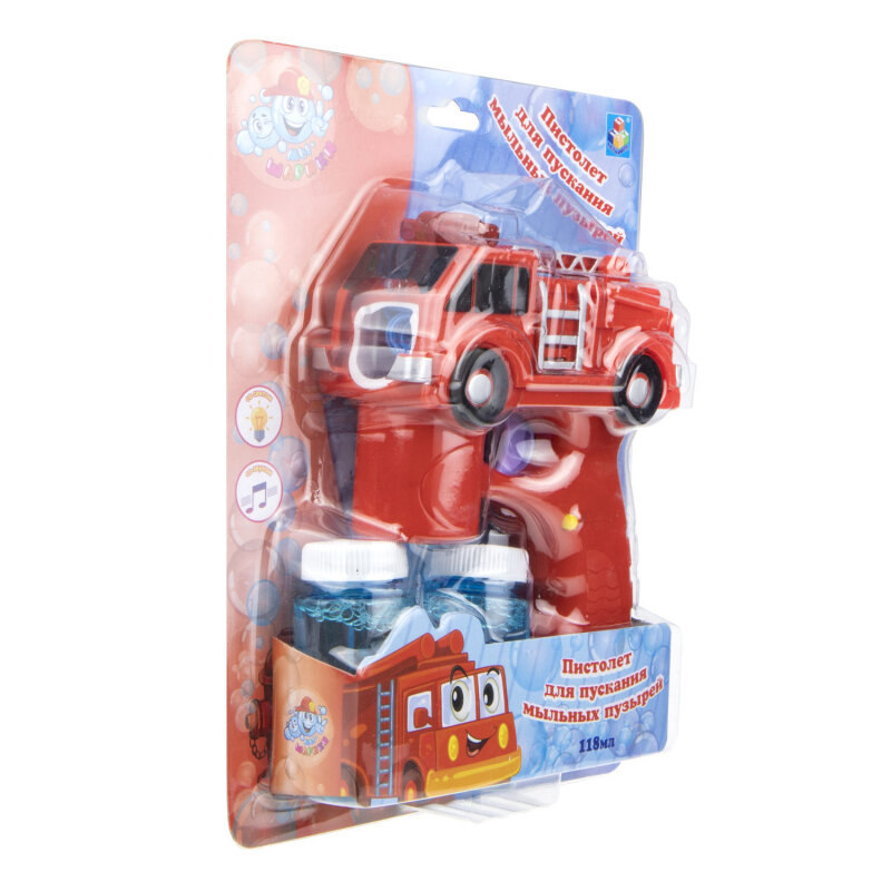 Игрушка в форме пожарной машины с механизмом для пускания мыльных пузырей. Для детей от 3-12 лет. В комплект входит мыльный раствор. Объем 118 мл. Работает от батареек. Чтобы начать пускать мыльные пузыри, нужно прикрутить бутылочку с мыльным раствором к пистолету и нажать на курок. При нажатии на курок появляются световые и звуковые эффекты.