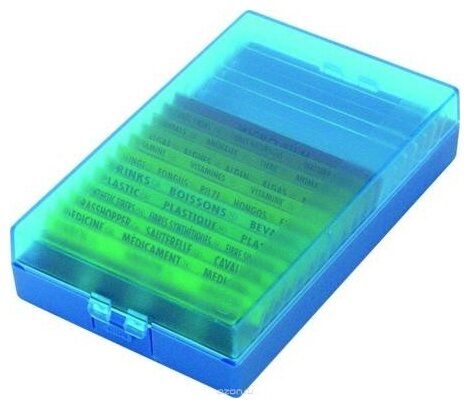 | Состав набора | 12 слайдов с 36 разными образцами (напитки, пластмассы, синтетические волокна, кузнечик, медицина и крахмал, микропленка, натуральные волокна, животные, водоросли, витамины и грибы), 6 пустых слайдов |