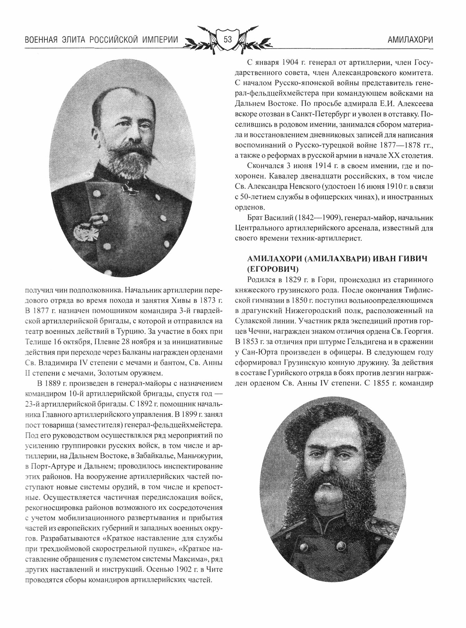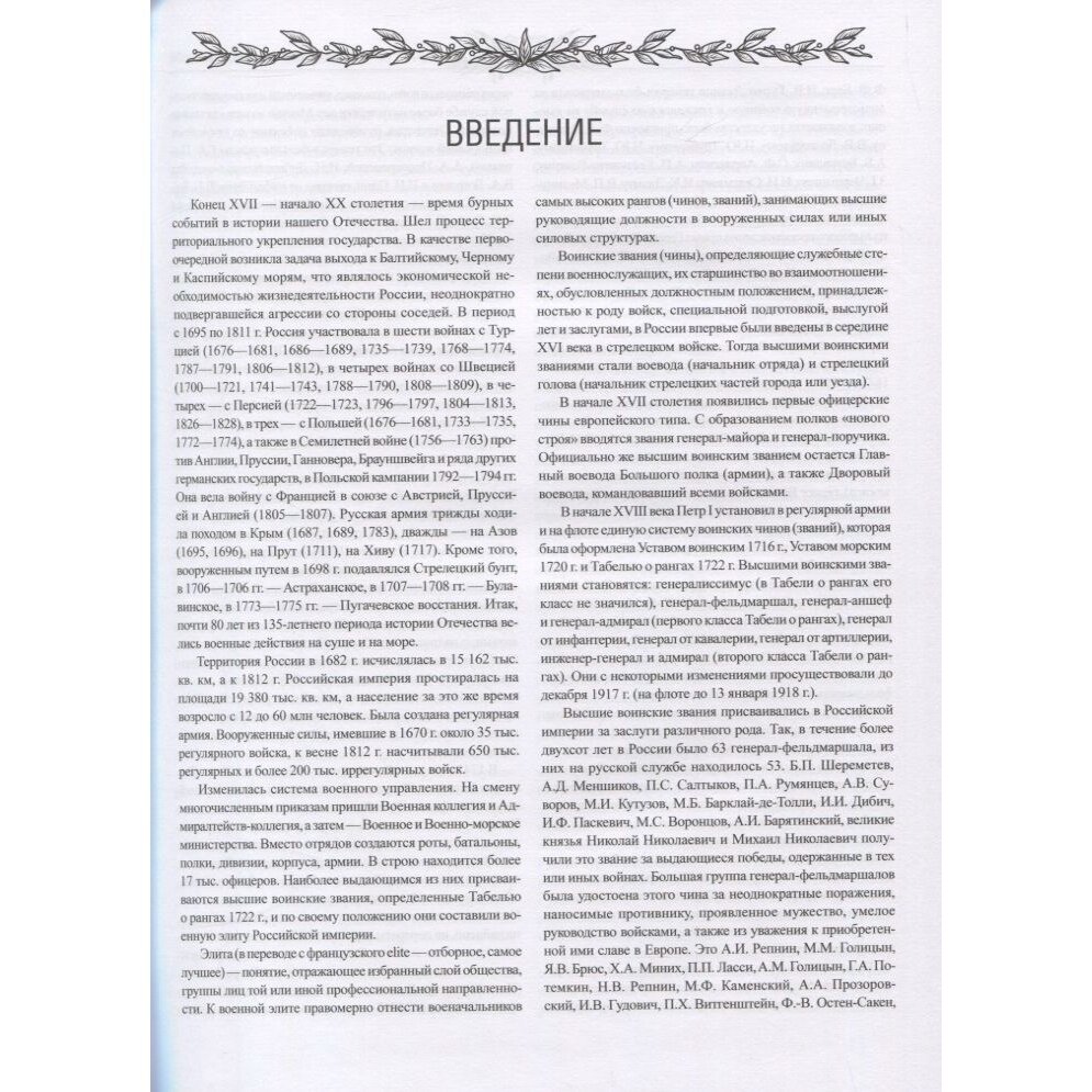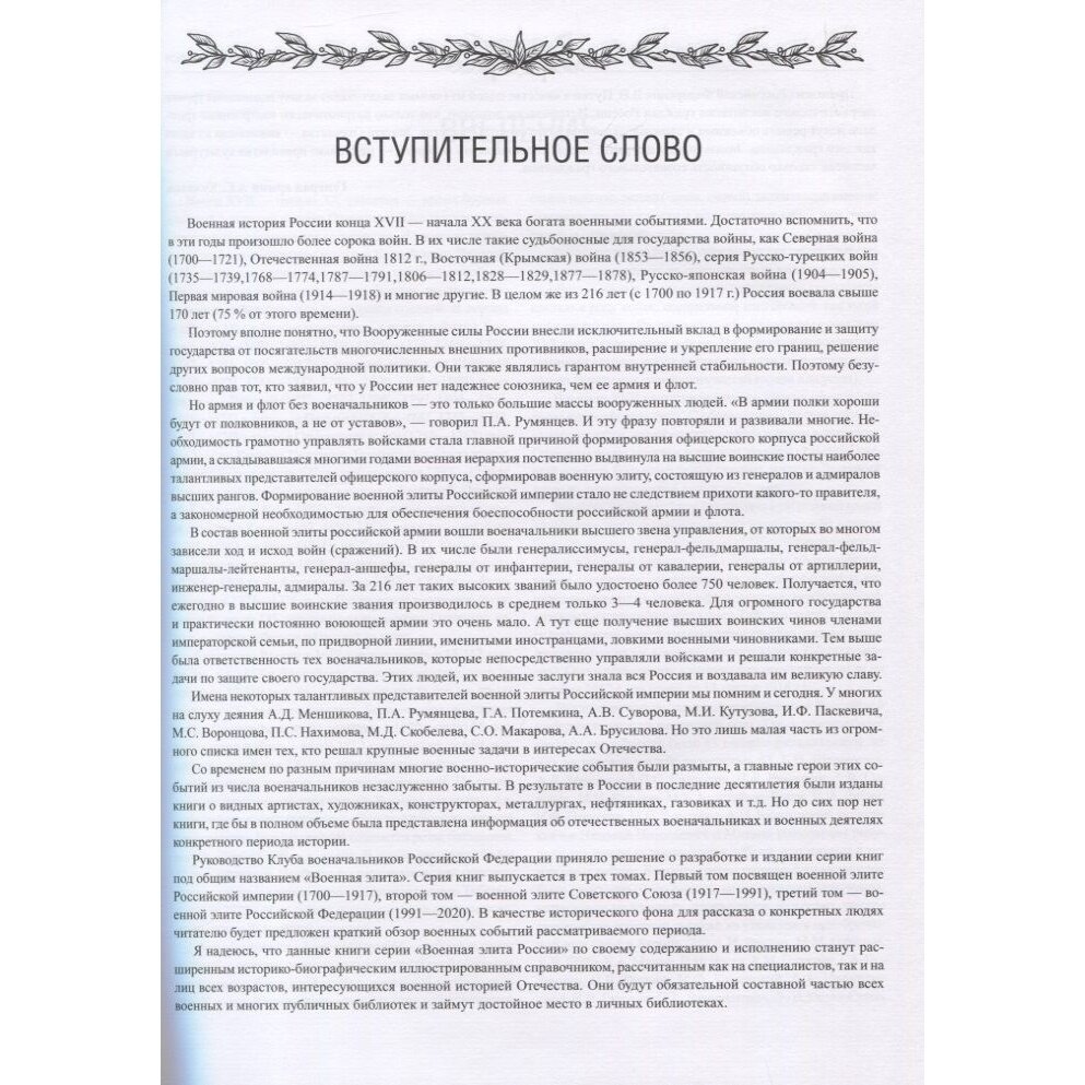 Военная элита Российской империи - военачальники самых высоких рангов, горячие патриоты России и профессионалы с высоким чувством ответственности, храбрые воины, прошедшие через горнило сражений. В их числе генерал-фельдмаршалы Г.А. Потемкин, А.А. Прозоровский, И.И. Дибич, генерал-аншефы В.А. Лопухин и П.И. Олиц, генерал от инфантерии П.И. Багратион, генерал от артиллерии К.А. Шильдер, адмиралы С.К. Грейг, П.С. Нахимов, Н.О. Эссен и другие. Многие из них до последней минуты своей жизни руководили сражениями, воодушевляя русских воинов на подвиги во имя Родины.
