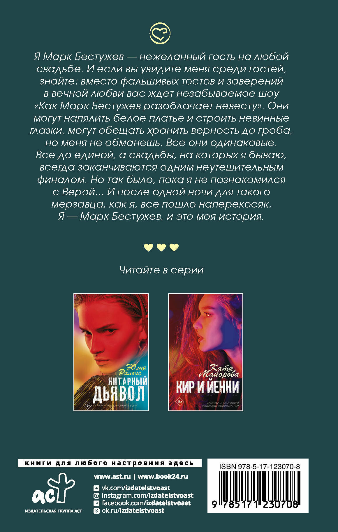 могут обещать хранить верность до гроба, но меня не обманешь. Все они одинаковые. Все до единой, а свадьбы, на которых я бываю, всегда заканчиваются одним неутешительным финалом. Но так было, пока я не познакомился с Верой… И после одной ночи для такого мерзавца, как я, все пошло наперекосяк. Я Марк Бестужев, и это моя история.