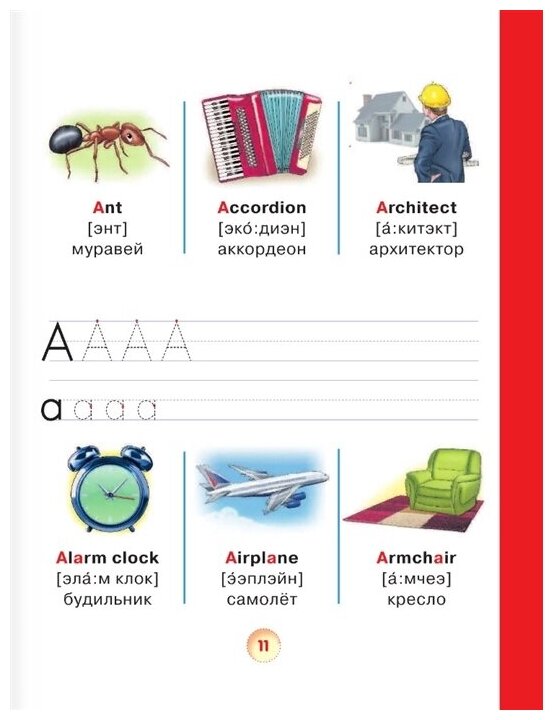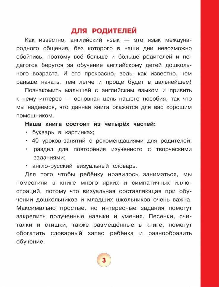 В книгу вошли букварь в картинках, 40 уроков-занятий с рекомендациями для родителей, творческие задания для повторения и закрепления пройденного материала, а также визуальный англо-русский словарь. Простая и понятная транскрипция, красивые авторские иллюстрации и интересный материал сделают изучение английского языка легким и увлекательным.