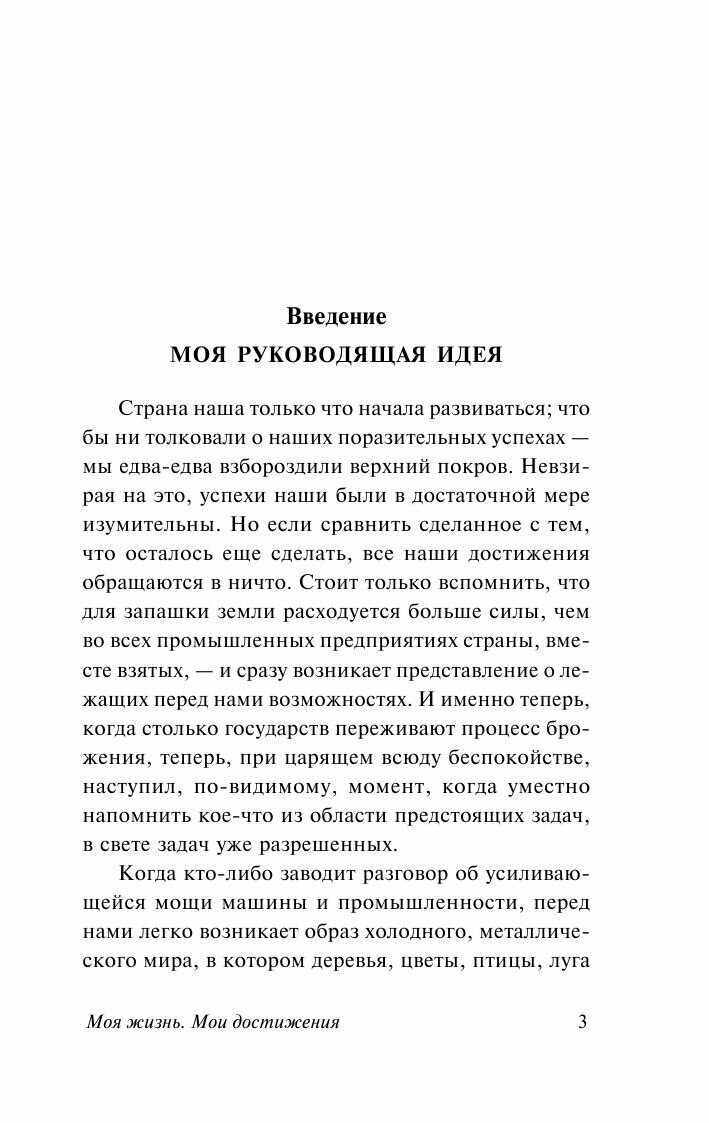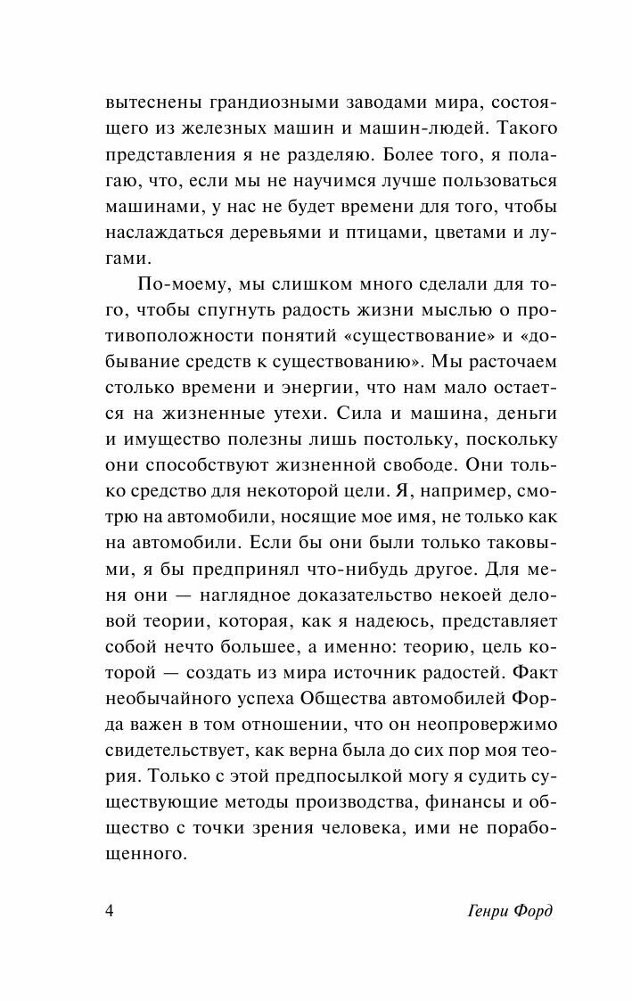 Книга «Моя жизнь. Мои достижения» (выдержавшая более сотни переизданий по всему миру, в том числе и в СССР) — это живая и захватывающая история человека, влюбленного в свою работу, ставшую для него источником вдохновения и смыслом существования. Форд раскрывается в ней не только как гениальный бизнесмен, изобретатель, инноватор и инженер, но прежде всего — как увлеченная личность, для которой работа стала делом всей жизни. Как прирожденный боец, который не боялся ни тяжелого труда, ни риска, выигрывал и ошибался, терял все и начинал заново, упорно, шаг за шагом приближаясь к воплощению своей мечты.