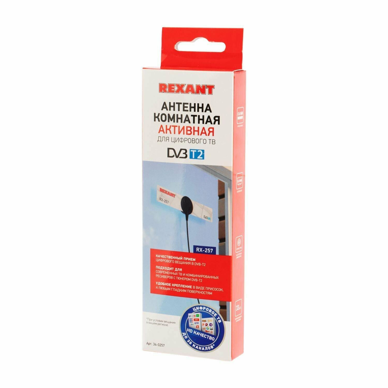 Комнатная активная антенна для цифрового телевидения REXANT DVB-T2 34-0257 - индивидуальное средство приема цифрового эфирного вещания в стандарте DVB-T2. Изделие совместимо с любыми моделями телевизоров (в том числе современными), цифровыми тюнерами DVB-T2 и цифровыми приемниками-ресиверами.