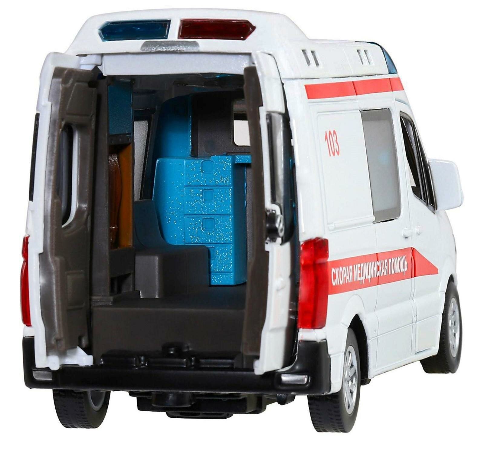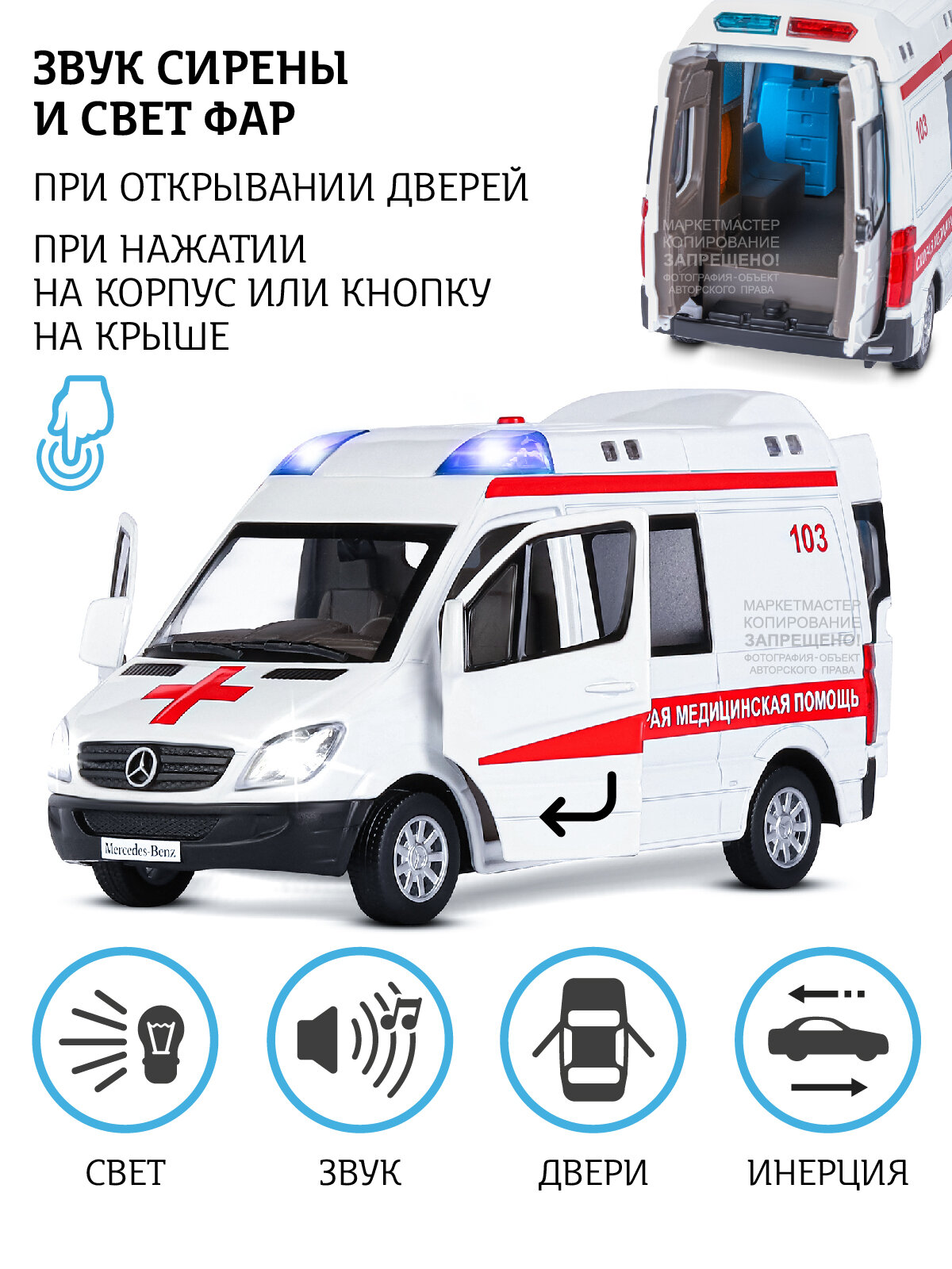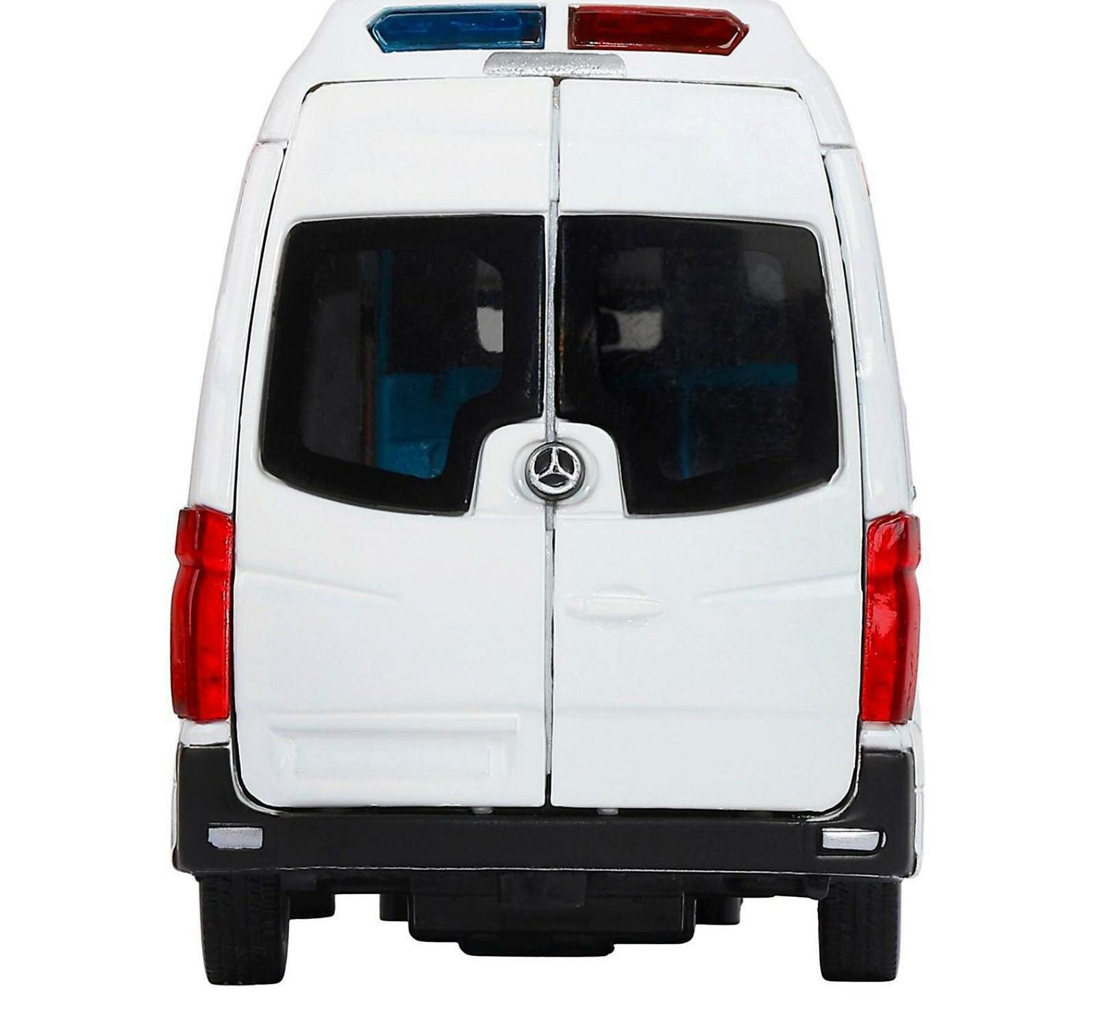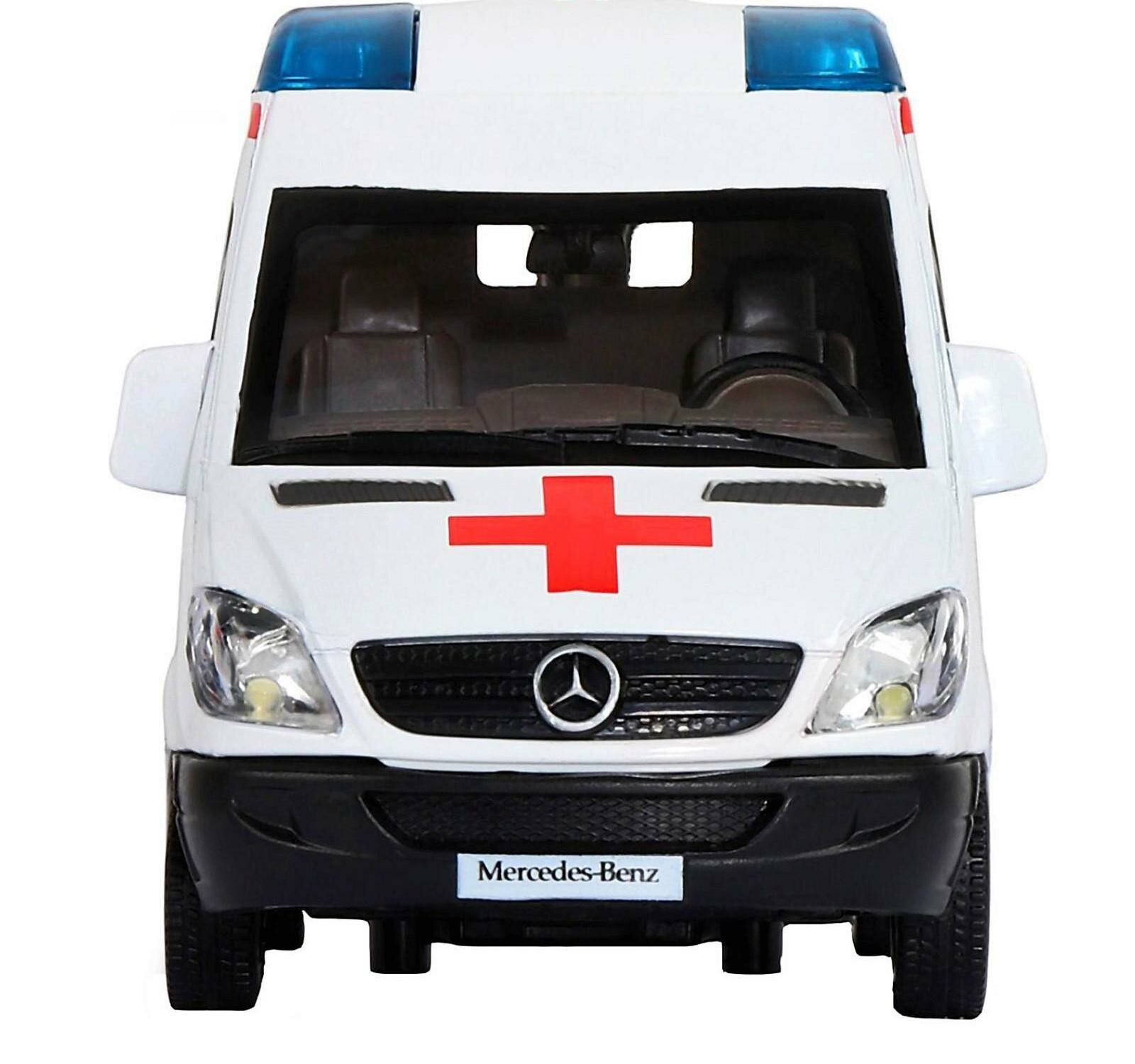 Лицензионная металлическая машинка Mercedes Sprinter Скорая помощь - уменьшенная копия настоящего автомобиля, с которой можно создавать множество увлекательных игровых сюжетов, полных приключений.