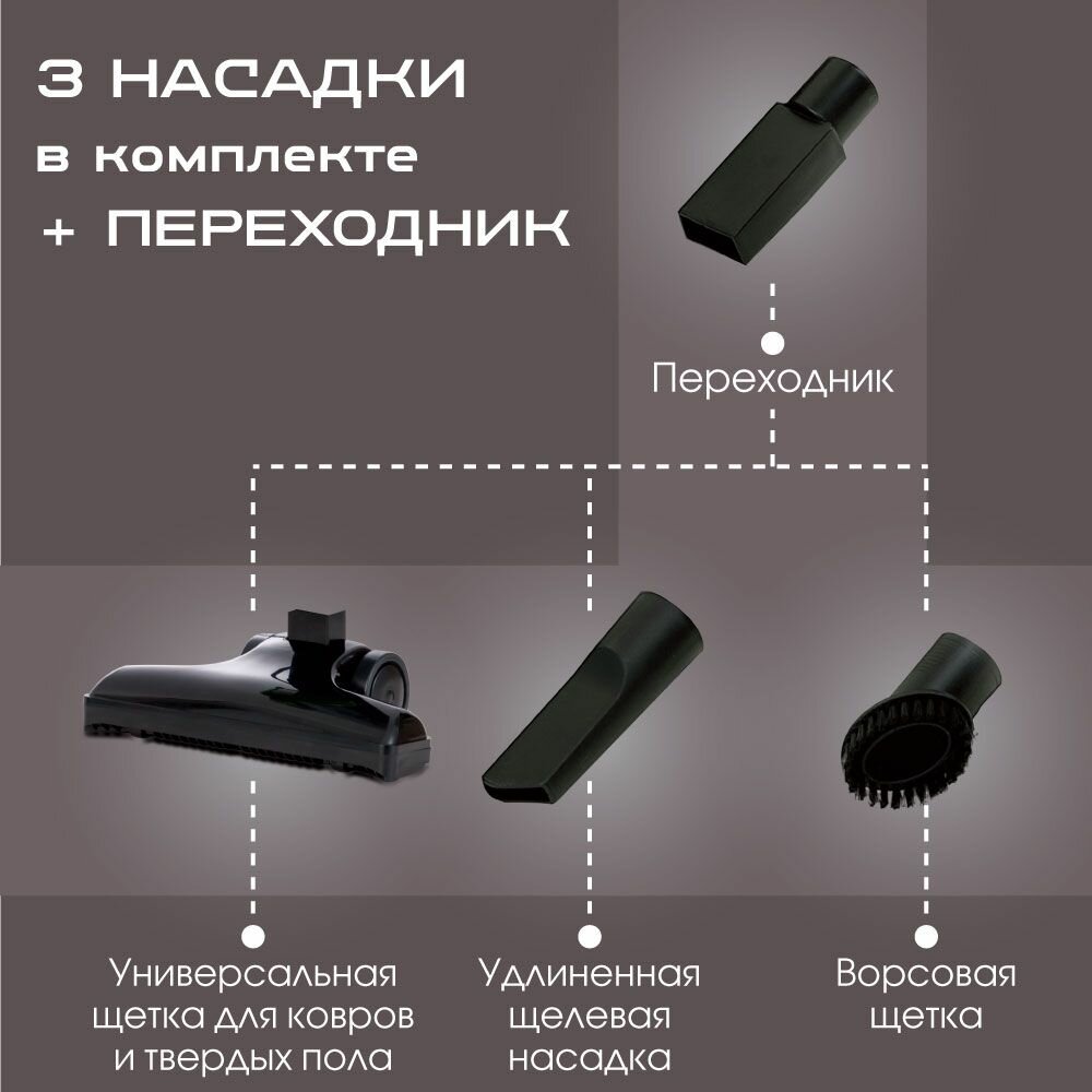 | Насадки в комплекте | универсальная щетка для ковров и твердых полов, удлиненная щелевая насадка, ворсовая щетка |