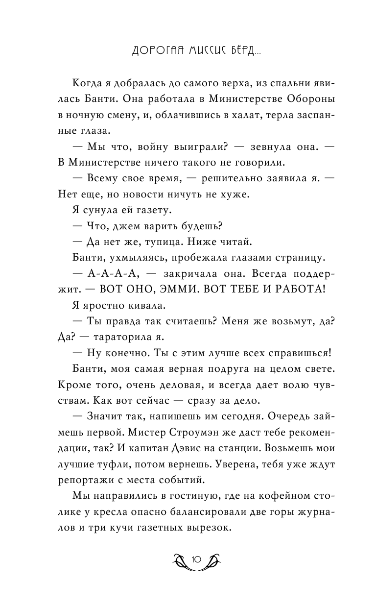 Эмми мечтает стать военкором и бывать во всех горячих точках Лондона, и наконец в газете появляется объявление о работе мечты. Однако выясняется, что она устраивается не в то место, впору бы отчаяться, но природное любопытство оказывается сильнее. Вместо обычной наборщицы Эмми становится тайным другом для многих отчаявшихся девушек и женщин, пишущих в журнал в надежде получить совет от миссис Берд.