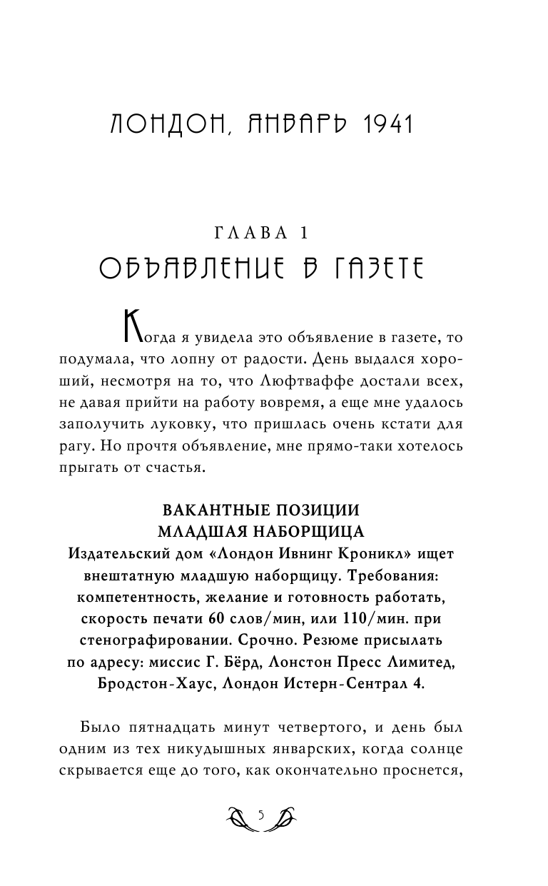 Действие романа разворачивается в Лондоне 1941. Эммелина Лейк трудится в это непростое время на нескольких работах, и однажды в ее руки попадает объявление: требуется младшая наборщица в известный издательский дом. Девушка просто мечтает стать журналистом, поэтому отправляется на собеседование. Ведь мечты должны сбываться, а возможности необходимо использовать.