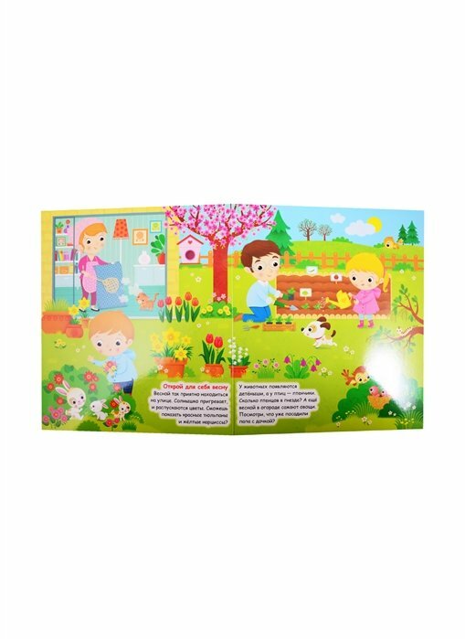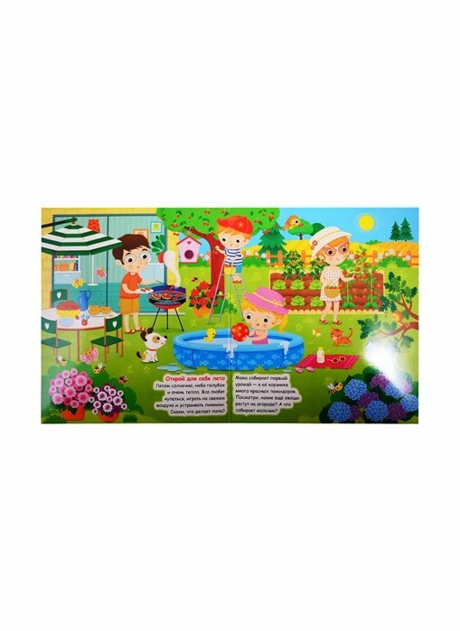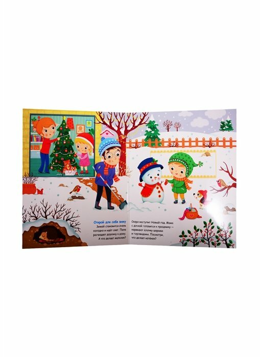 Есть развороты с красочными иллюстрациями про сезоны, а также 2 черно-белых (на них ребенок учится рисовать – можно стирать и пробовать снова). Прикольная вещь – загадки, отгадки на них скрываются под картонными окошками. Ребенок так может проверить себя. Качественная полиграфия, современные картинки.