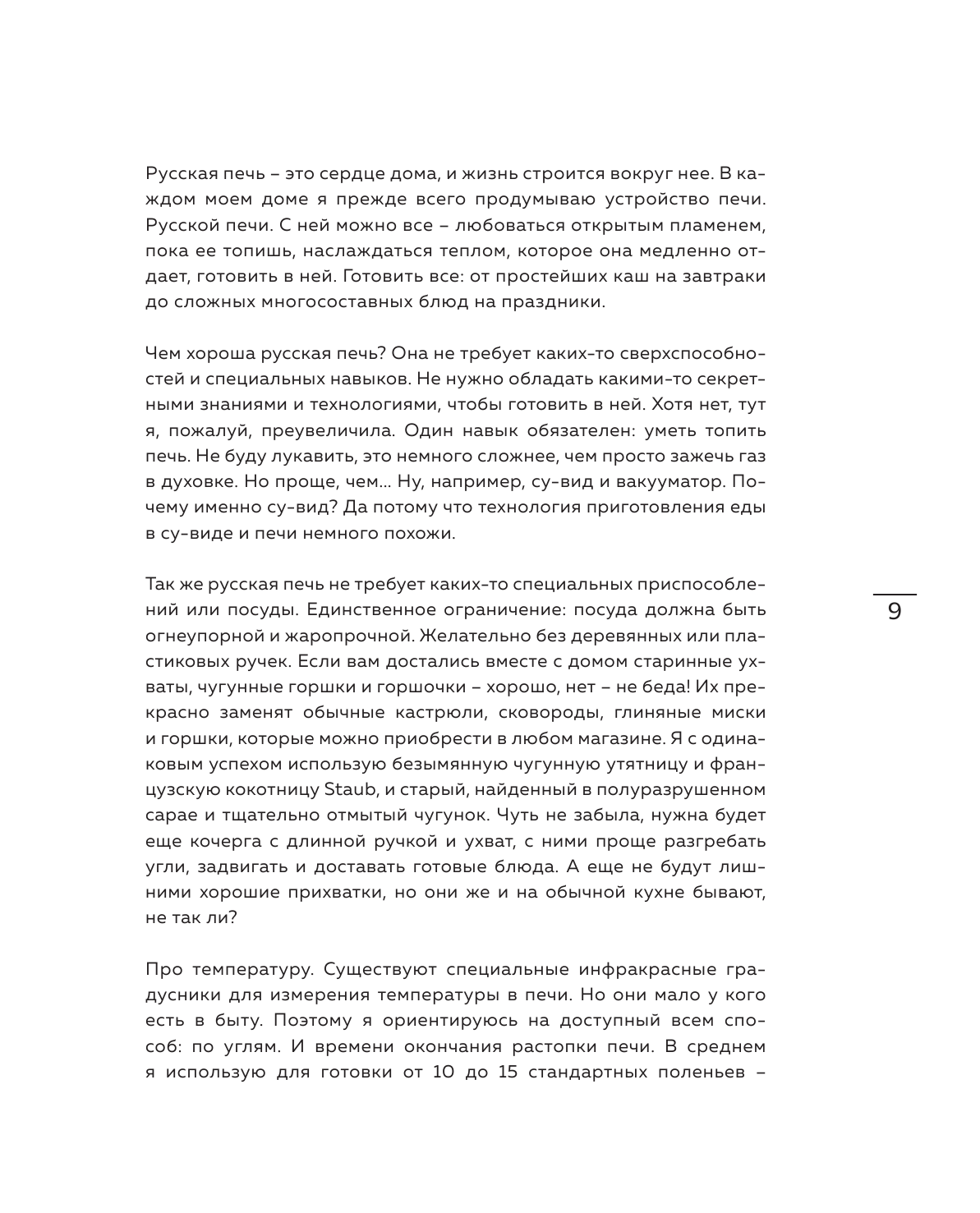 Отличная книга, даже больше чем я ожидала от неё. Прекрасно оформлена, предисловие к каждой главе написаны с огромной теплотой. Автор безумно любит деревню, ее уклад жизни, а Главное - печь. Мы совсем про неё забыли. У нас индукционные плиты или газовые... мы стремимся купить мультиварки, пароварки, Грили.... но вспоминая детство и русскую печь, понимаю как много мы теряем используя другую утварь. Вкус пищи из печи изумительный. Конечно, мы живем в городе и печь непозволительна а наших квартирах, но если есть загородный дом, обязательно постройте пусть маленькую печь. Ее возможности невозможно описать, их нужно чувствовать.
