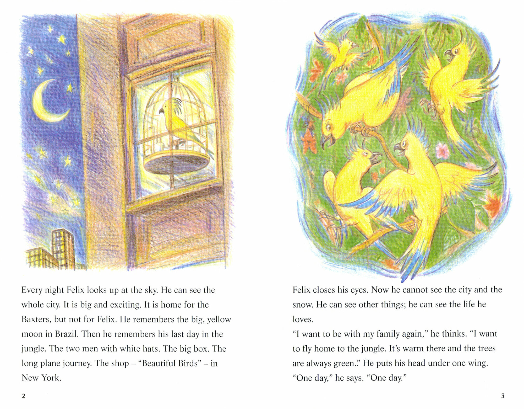 Felix is not a happy bird. He comes from Brazil but he doesn’t live there. He lives in New York in a cage. Then one day his cage opens and Felix says goodbye to New York. Can he find his family in Brazil again?