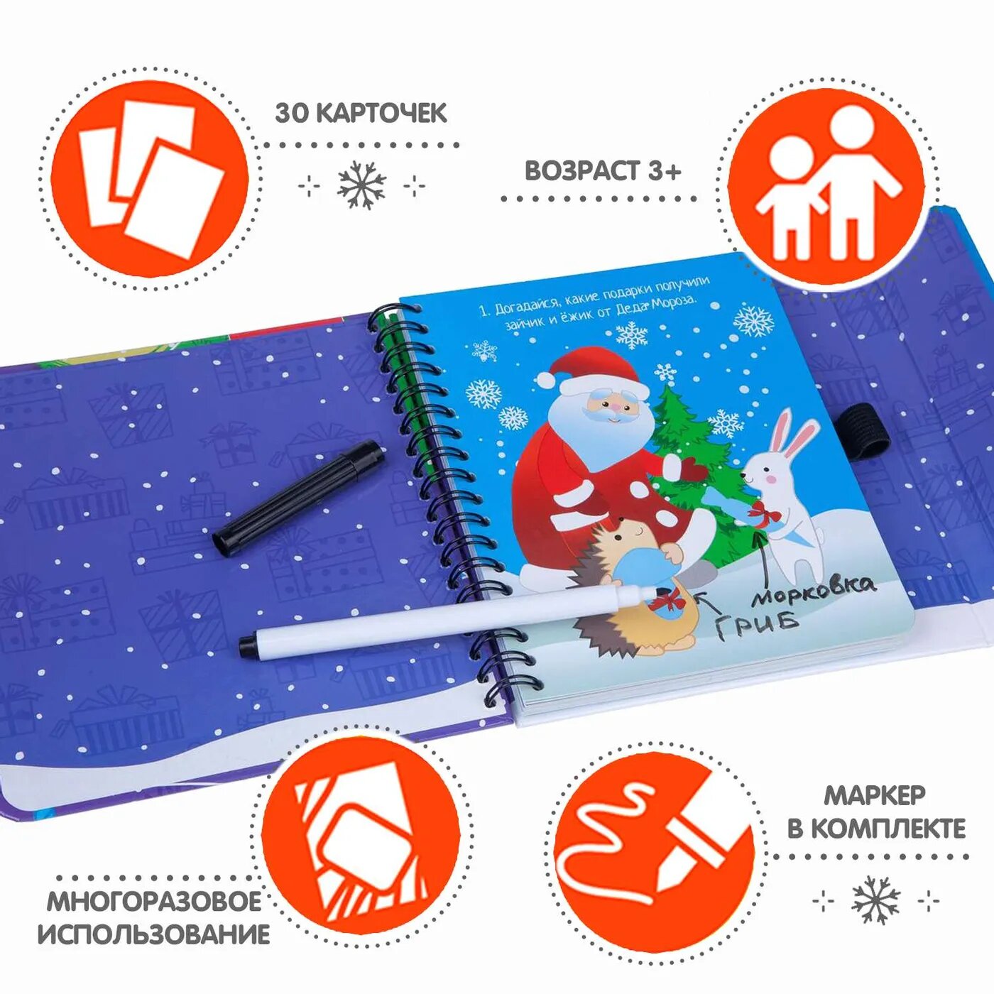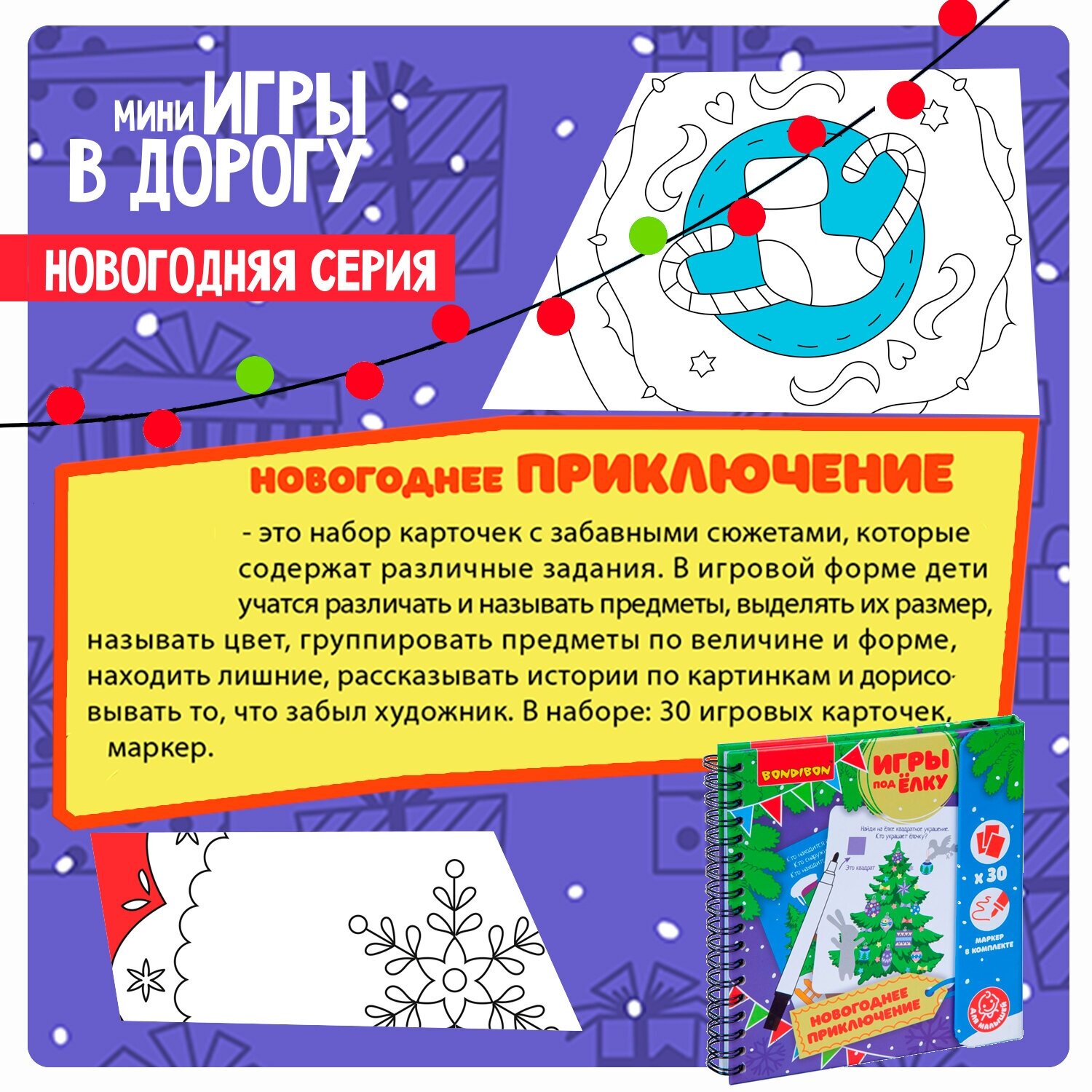 НОВОГОДНЕЕ ПРИКЛЮЧЕНИЕ- это набор карточек с забавными сюжетами, которые содержат различные задания. В игровой форме дети учатся различать и называть предметы, выделять их размер, называть цвет, группировать предметы по величине и форме, находить лишние, рассказывать истории по картинкам и дорисовать, что забыл художник .В наборе: 30 игровых карточек, маркер. Вместе с замечательными мини-играми под ёлку от BONDIBON вы прекрасно проведете свой досуг в новогодние праздники! Красочные и интересные, они помогут провести время празднично и с пользой.