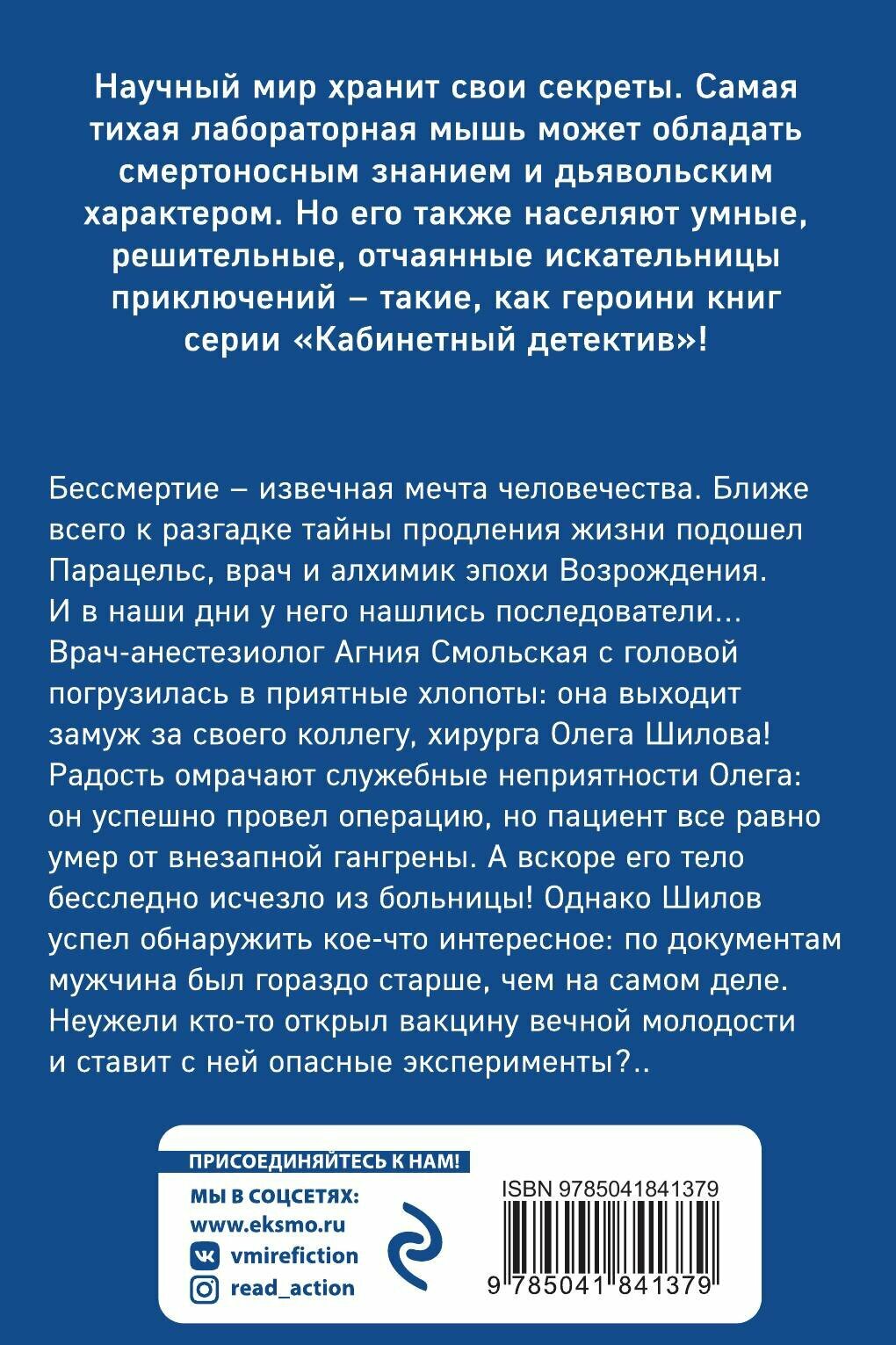Бессмертие - извечная мечта человечества. Ближе всего к разгадке тайны продления жизни подошел Парацельс, врач и алхимик эпохи Возрождения. И в наши дни у него нашлись последователи… Врач анестезиолог Агния Смольская с головой погрузилась в приятные хлопоты: она выходит замуж за своего коллегу, хирурга Олега Шилова! Радость омрачают служебные неприятности Олега: он успешно провел операцию, но пациент все равно умер от внезапной гангрены. А вскоре его тело бесследно исчезло из больницы! Однако Шилов успел обнаружить кое-что интересное: по документам мужчина был гораздо старше, чем на самом деле. Неужели кто-то открыл вакцину вечной молодости и ставит с ней опасные эксперименты?..