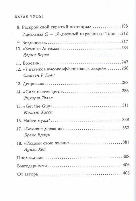 Каждая глава посвящена отдельной книге, затрагивающие почти все сферы нашей жизни: страхи, деньги, мечты и т.д. Суть книги подаётся очень интересно: с читателем беседует словно сам автор рассматриваемой книги, приводя свои аргументы и лаконично излагая суть работы, которую нужно над собой провести, а Мэриэнн вставляет свои комментарии и эпичные описания попыток осуществить эти советы. И это будут очень ОЧЕНЬ эксцентричные, незабываемые, порой унизительные и тяжелые, но вдохновляющие, безумные и веселые способы найти путь к идеальной версии себя!