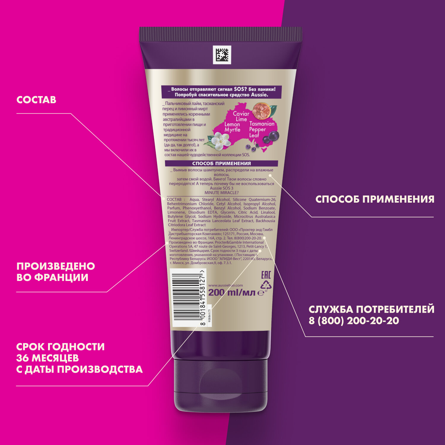 | Способ применения | Вымыв волосы шампунем, распредели по влажным волосам, затем смой водой. И — о чудо! — твои волосы возродятся. А теперь почему бы не воспользоваться реконструктором Aussie SOS 3 Minute Miracle? |