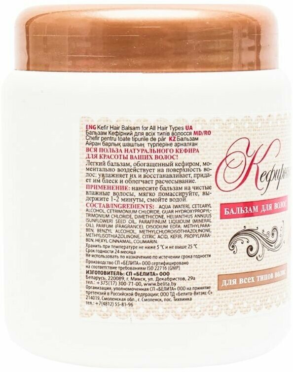 | Состав | вода, цетеариловый спирт, хлорид цетримония, хлорид гуаргидроксипропилтримония, диметикон, масло Helianthus Annuus (подсолнечное), масло вазелиновое, парфюмерная композиция, парфюмерная композиция, ЭДТА динатрия, метилпарабен, бензиловый спирт, метилхлоризотиазолинон, метилизотиазолинон, кислота лимонная, Кефир, пропилпарабен, гексилциннамаль, кумарин |