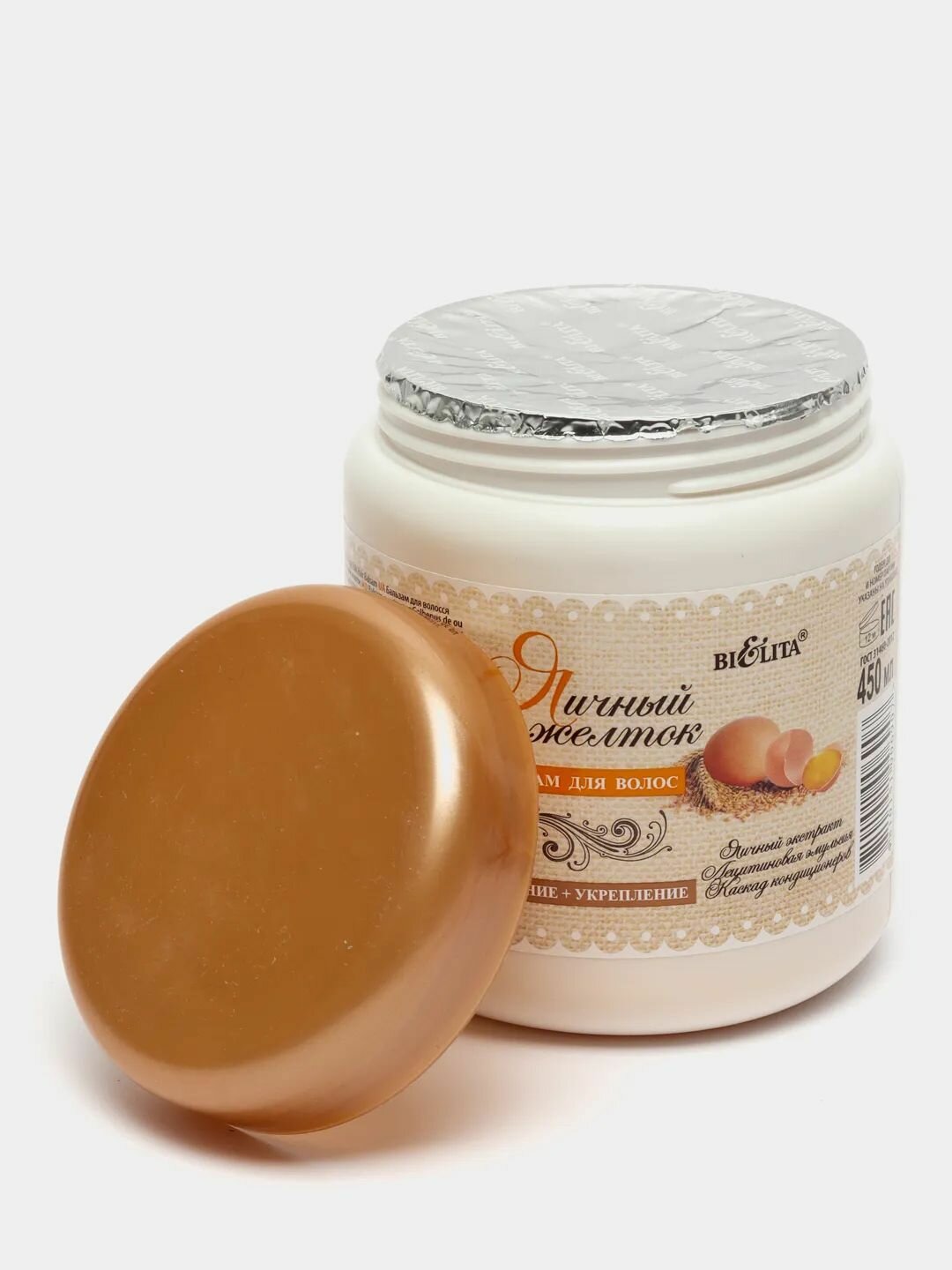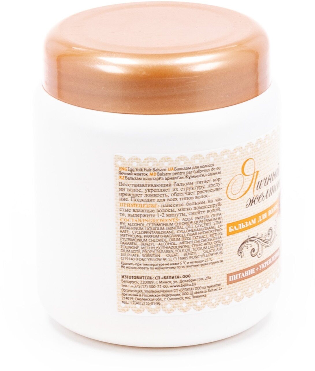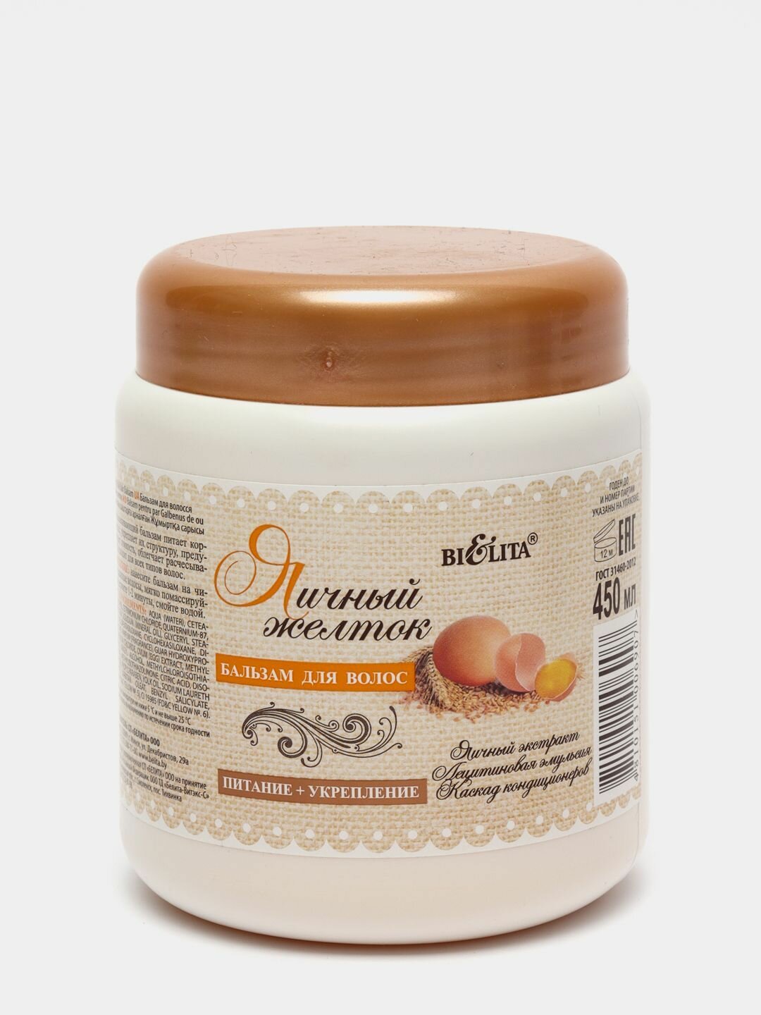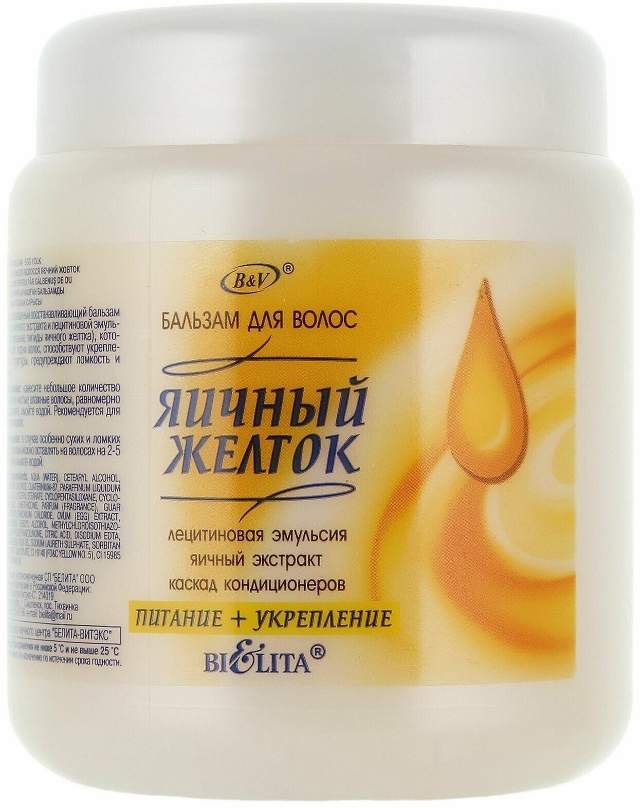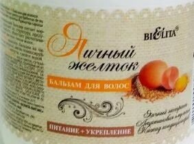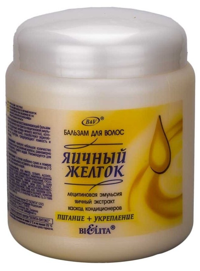 Бальзам для волос Белита Яичный желток на основе яичного экстракт и лецитиновой эмульсии питает корни волос, способствует укреплению и выравниванию их структуры, предупреждает ломкость и сечение.