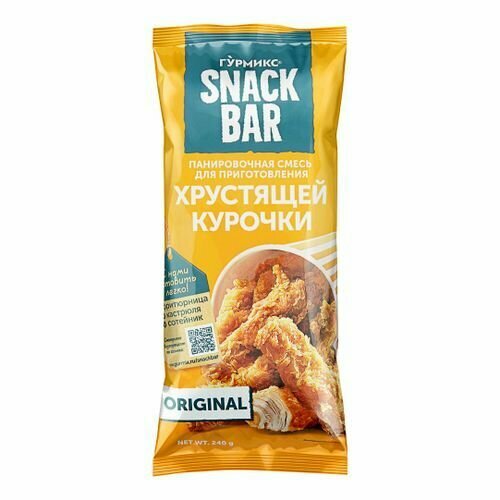 Описание товара:Смесь панировочная Snack Bar для приготовления хрустящей курочки.Состав товара:Мука пшеничная хлебопекарная высшего сорта, крахмал кукурузный, соль, яичные продукты, сахар, чеснок, перец красный, ароматизаторы, красители (куркумин, каротины), усилитель вкуса и аромата глутамат натрия.Меры предосторожности:После вскрытия упаковки продукт хранить в закрытом виде при температуре от 0°С до 25°С и относительной влажности воздуха не выше 75% не более 30 суток.
