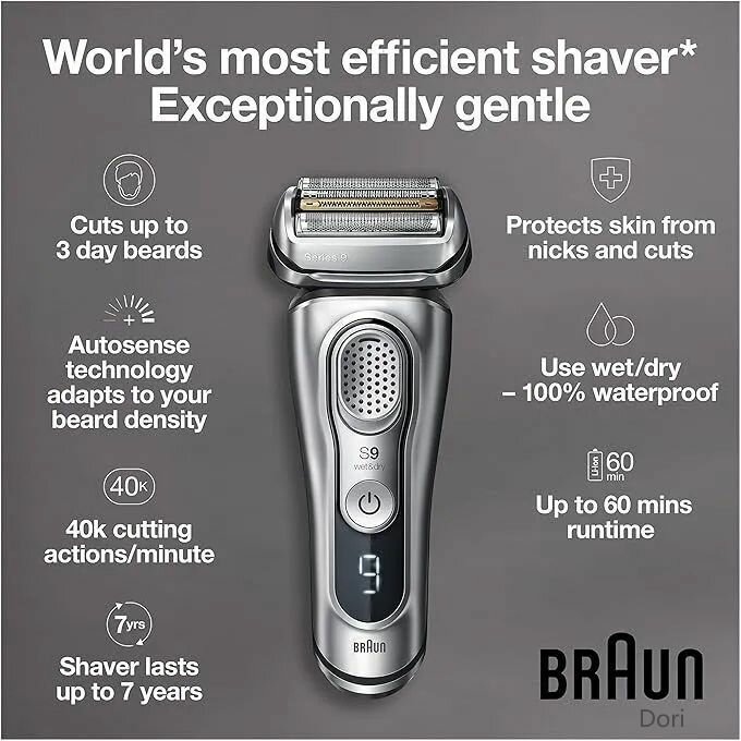 Электробритва Braun Series 9 с плавающим рабочим блоком и 5 бритвенными насадками адаптируется под контуры лица. Модель применяется для сухого или влажного бритья.
