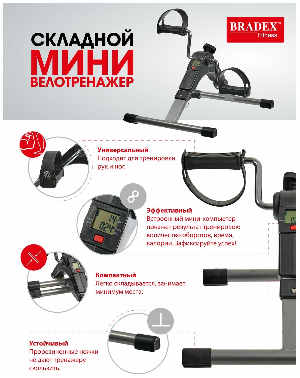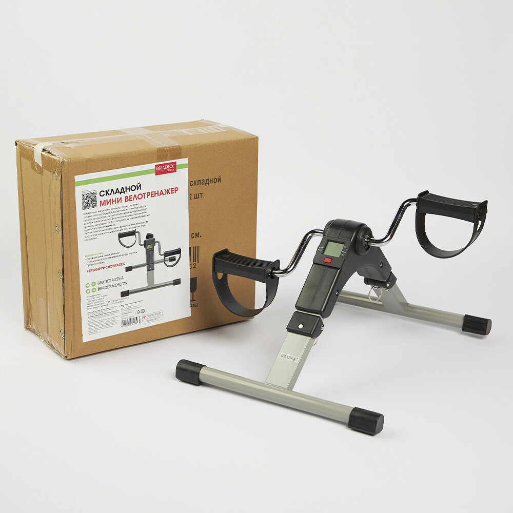 Bradex Мини велотренажер складной – универсальный спортивный тренажер для эффективного фитнеса у себя дома в любое время. Имитирует движение по лестнице, направленное на укрепление мышц, тренировки сердца и сжигания жира. Миникомпьютер покажет все необходимые значения количество шагов, шагов в минуту, калорий и времени. Особенности: компактность, позволяющая использовать тренажер даже в небольшой квартире регулируемый ход нагрузки для комфортного занятия спортом удобный размер педалей, повышающий эффективность тренировки миникомпьютер с счетчиком шагов, шагов в минуту, калорий и времени крепление для эспандеров с карабинами.