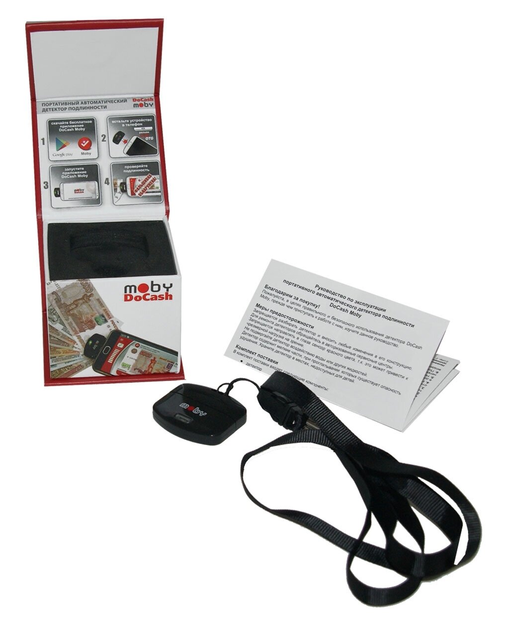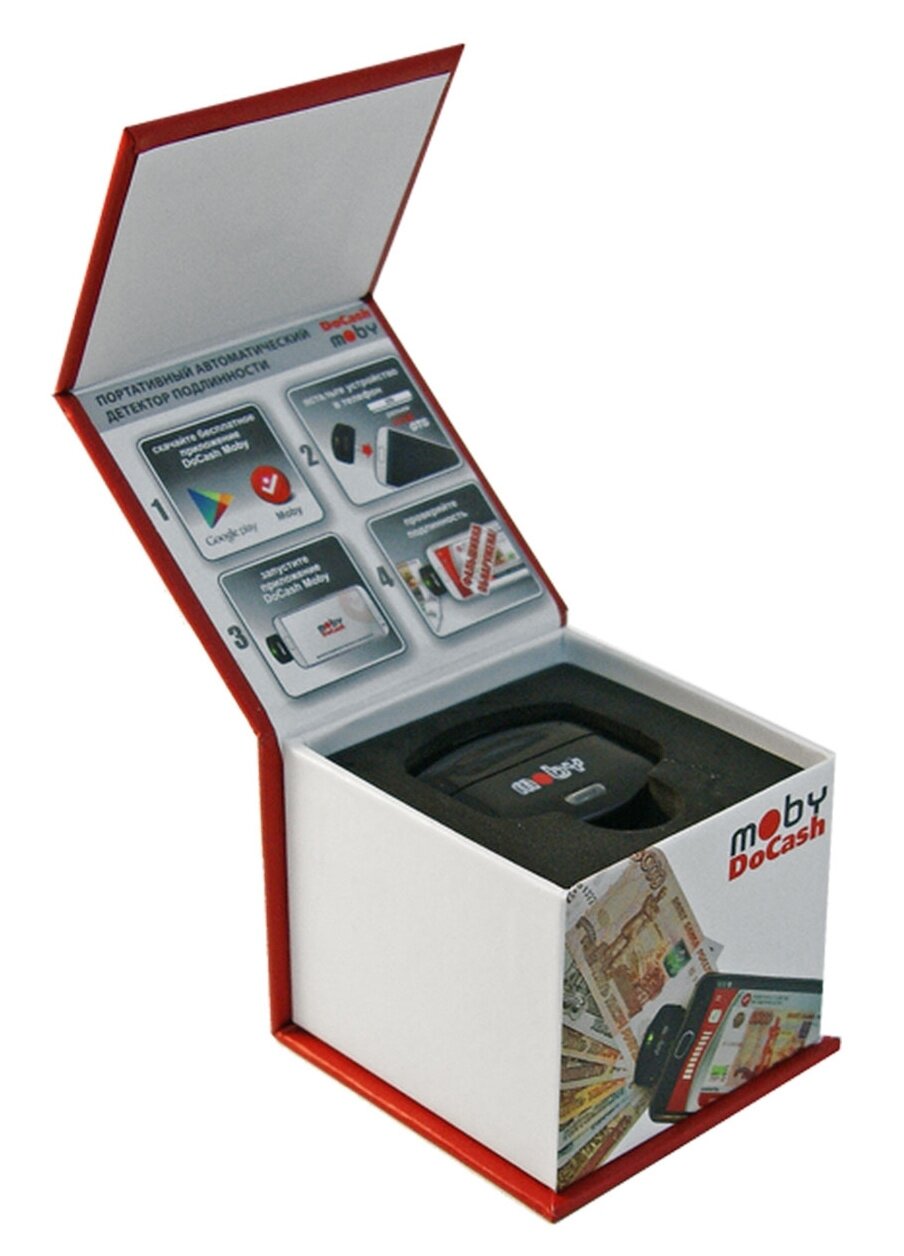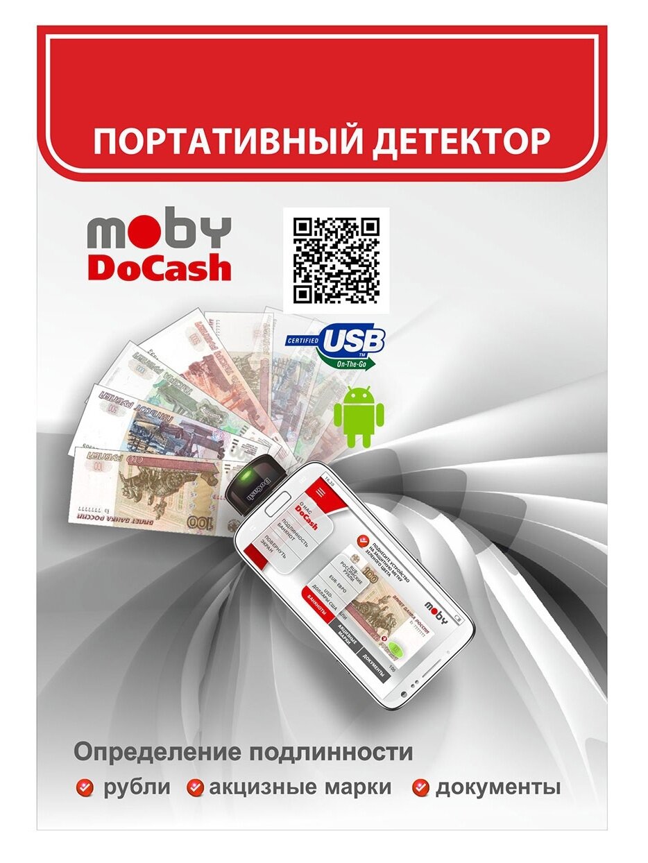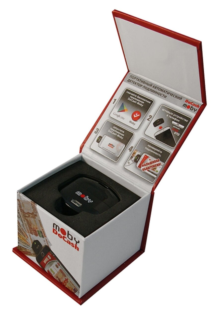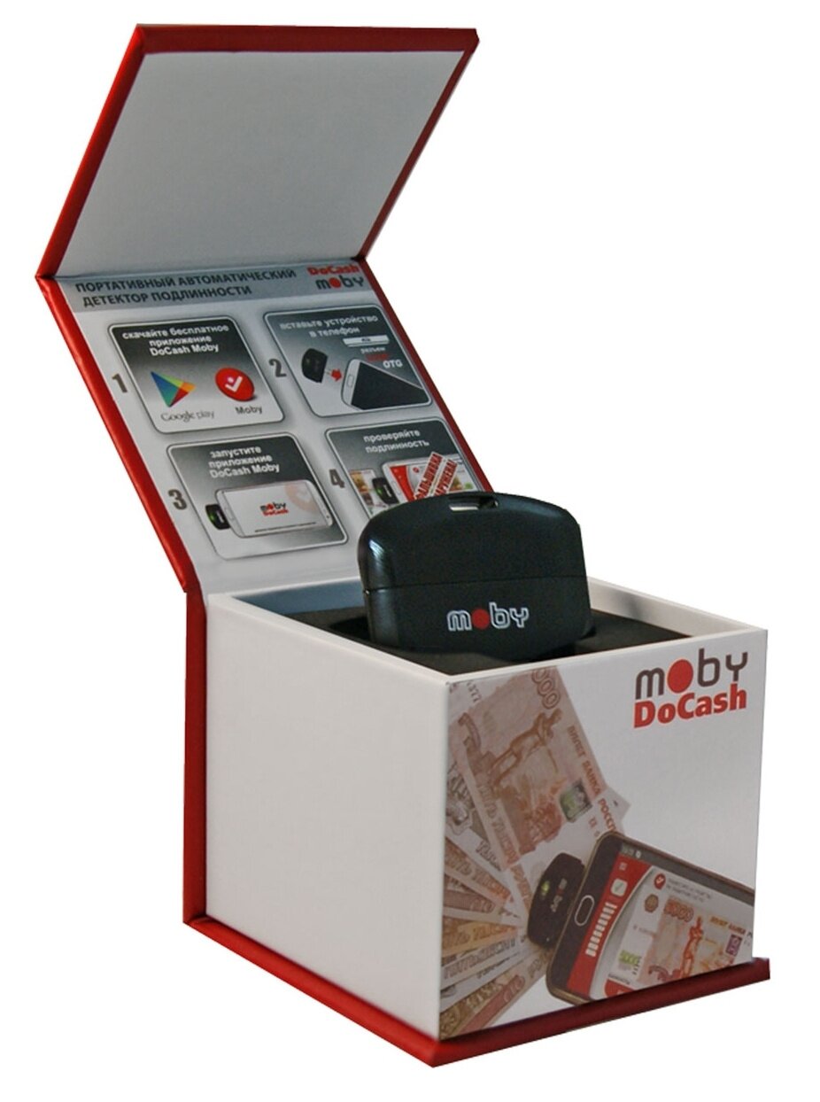 | Прочие особенности и свойства | Детектор DoCash Moby — это портативный аппарат для проверки на подлинность денежных банкнот, паспортов и загранпаспортов, акцизных марок, иных ценных бумаг и документов.,,Главные преимущества портативного детектора подлинности DoCash Moby,Устройство успешно прошло тестирование специалистами Центрального Банка РФ.,,Чтобы начать работу с этим гаджетом, Вам необходимо иметь:,,смартфон с ОС Android с поддержкой USB OTG;,скачанное и установленное бесплатное одноименное приложение.,Интерактивный интерфейс с подсказками на экране смартфона помогает разобраться в работе этой модели абсолютно любому человеку.,,Инновационная, запатентованная система проверки, делает возможным с помощью аппарата распознавать и выявлять подделки всех видов банкнот, документов и акцизных марок. Несмотря на его размеры, которые позволяют носить его в кармане в качестве брелока, детектор обладает впечатляющей скоростью сканирования — 1 сек.,Удобный детектор подлинности DoCash Moby,Разработчик устройства оснастил его рядом полезных функций, чтобы работать с ним было просто и комфортно:,,светодиодная и звуковая индикация;,отображение результатов;,проверки на экране и виброотклик смартфона;,начало работы и проверка в автоматическом режиме, что исключает необходимость в дополнительных специальных знаниях;,не требуется дополнительного источника питания. |