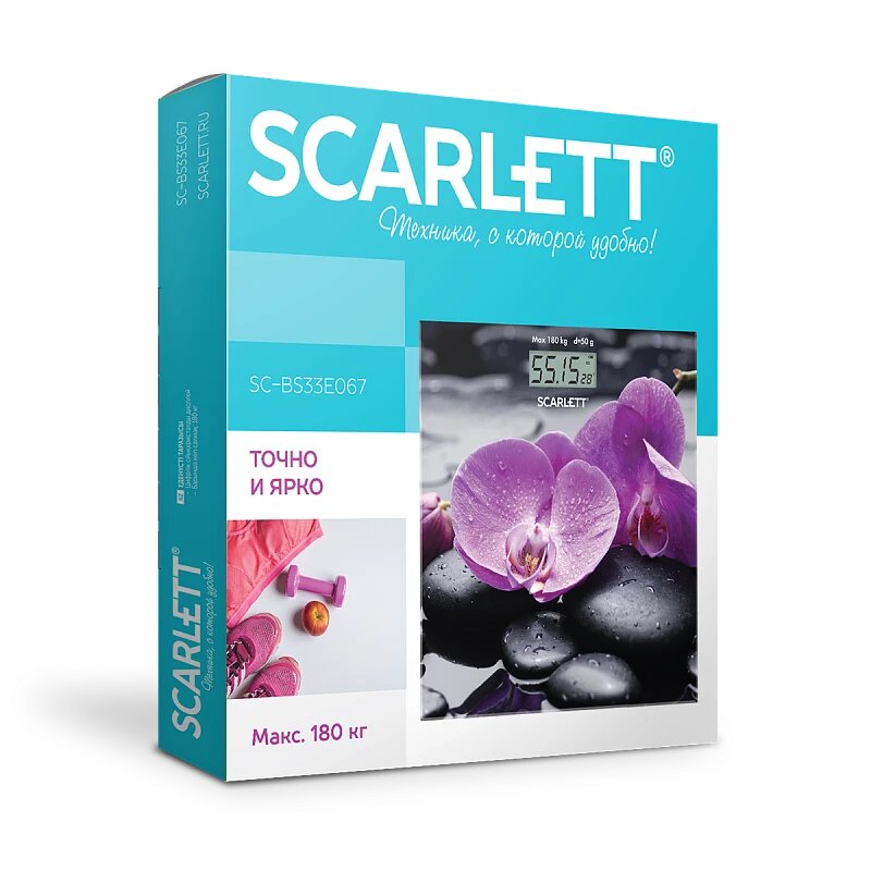 | Прочие особенности и свойства | Напольные весы SC-BS33E067 - это простой и удобный способ контролировать свой вес! Благодаря высокочувствительным датчикам погрешность составит не более одной цены деления: 100 г. Максимальный вес: 180 кг. Ультратонкий дизайн обеспечит компактное хранение. Материал платформы - высокопрочное закаленное стекло. Автоматическое включение и выключение позаботятся об экономом расходе заряда батареи. Индикатор перегрузки и индикатор батарейки обеспечат комфортную эксплуатацию. Большой жидкокристаллический дисплей 74 x 30 мм делает эксплуатацию весов комфортнее. Прорезиненные ножки придают дополнительной устойчивости и предотвращают скольжение. А приятное цветовое решение и яркая композиция позволят прибору не только вписаться в любой интерьер, но и радовать глаз каждый день! |