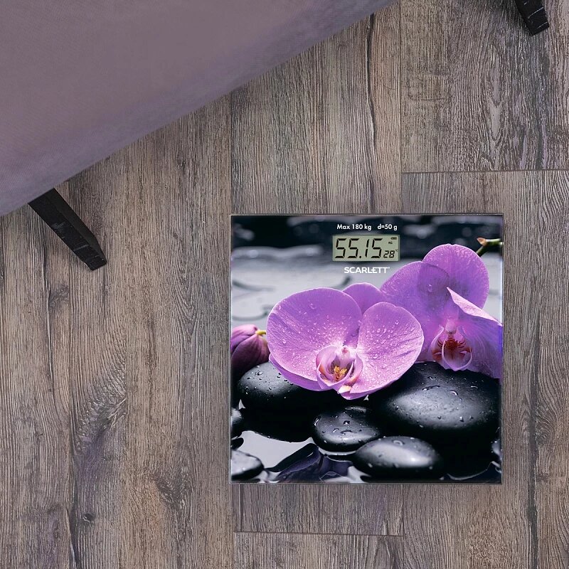 Напольные весы - это простой и удобный способ контролировать свой вес! Благодаря высокочувствительным датчикам погрешность составит не более одной цены деления: 100 г. Максимальный вес: 180 кг. Ультратонкий дизайн обеспечит компактное хранение. Материал платформы - высокопрочное закаленное стекло. Автоматическое включение и выключение позаботятся об экономном расходе заряда батареи. Индикатор перегрузки и индикатор батареи обеспечат комфортную эксплуатацию. Большой жидкокристаллический дисплей 74x30 мм делает эксплуатацию весов комфортнее. Прорезиненные ножки обеспечивают дополнительную устойчивость и предотвращают скольжение. А приятное цветовое решение и яркая композиция позволят прибору не только вписаться в любой интерьер, но и радовать глаз каждый день!