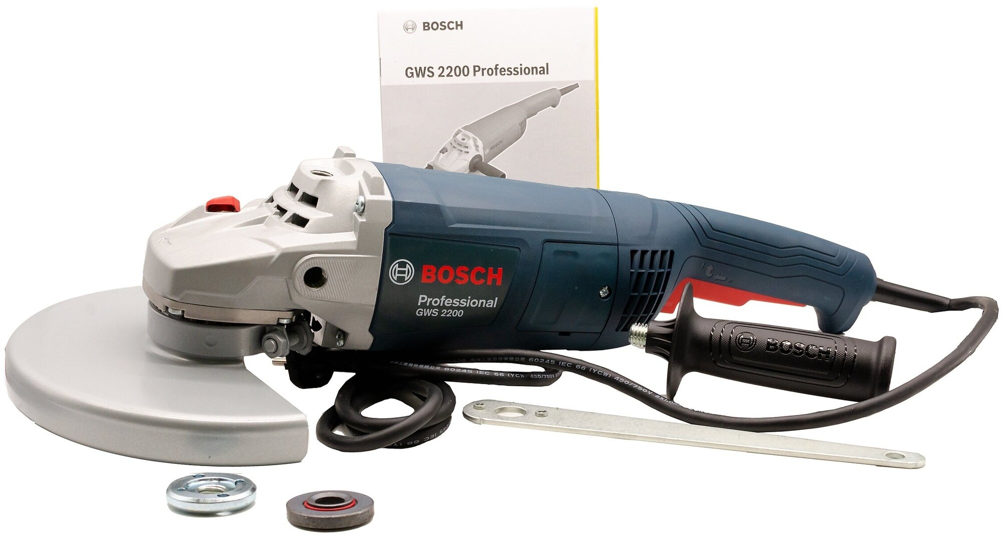 Углошлифовальная машина Bosch GWS 2200 диаметр диска 230мм 06018C10R0 применяется для шлифования и зачистки поверхностей, а также для резания деталей из различных материалов. Оснащена новым двигателем, который обеспечивает на 25% более высокую способность к перегрузкам в сравнении с предшественником. Это способствует высокой скорости удаления материала. Дополнительная рукоятка обеспечивает надежное удержание инструмента во время работы.