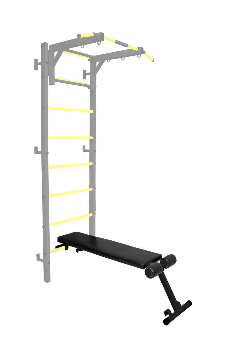 Благодаря универсальной складной конструкции скамейка для пресса - в собранном состоянии переворачивается, поднимается и крепится на полукруглые крепления к стойкам лестницы ДСК. После такой трансформации доска для пресса становится мягкой опорой для спины, обеспечивая более комфортные упражнения на турнике. После занятий Вы можете переместить ее к стене тем самым освободив дополнительное пространство в комнате.