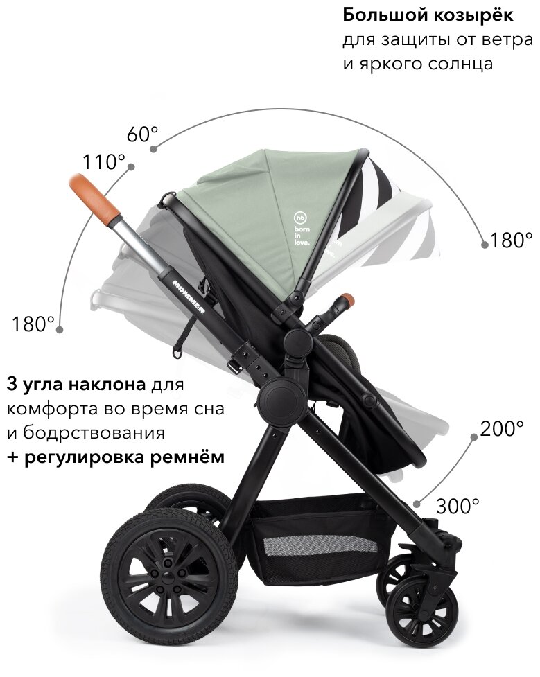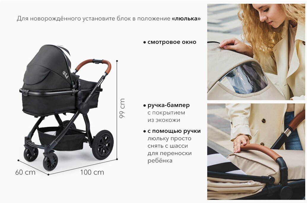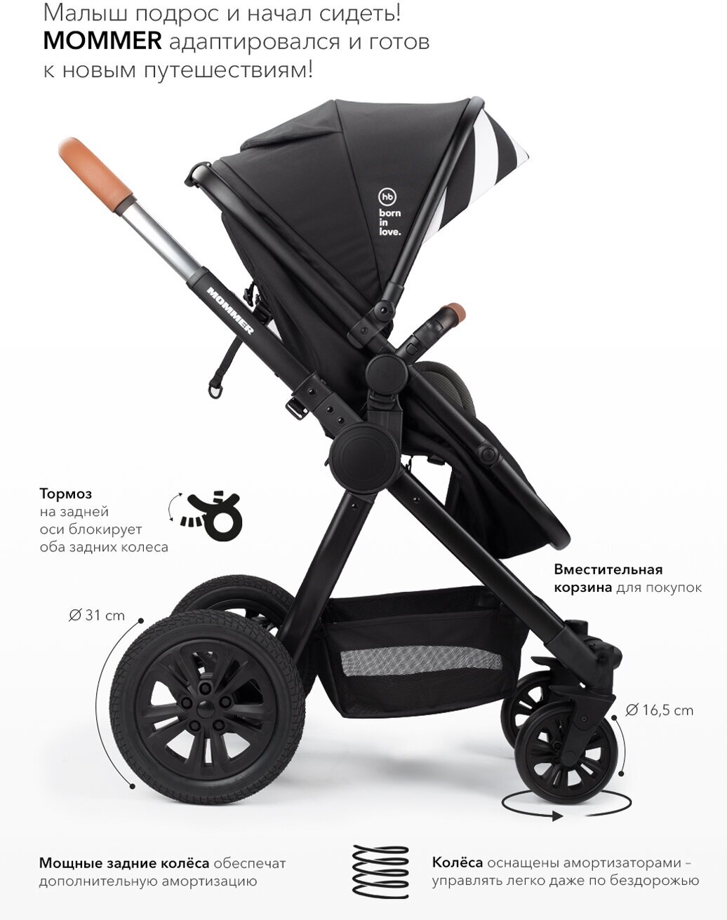 Коляска-трансформер MOMMER – универсальный вариант для детей с рождения и до 3 лет. Для новорождённого установите блок в положение «люлька». Благодаря удобной ручке-бамперу люльку просто снять с шасси для переноски ребёнка.
