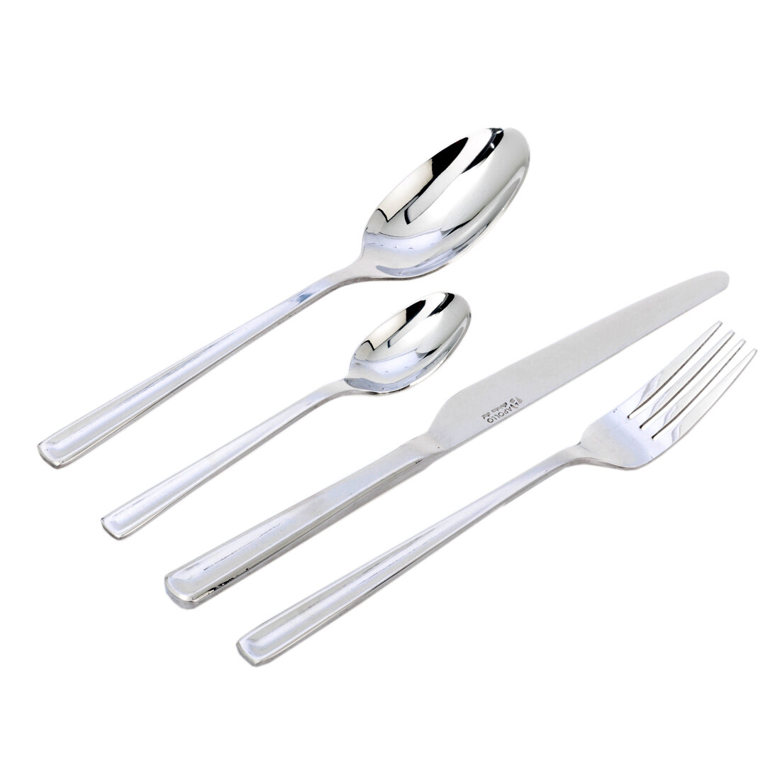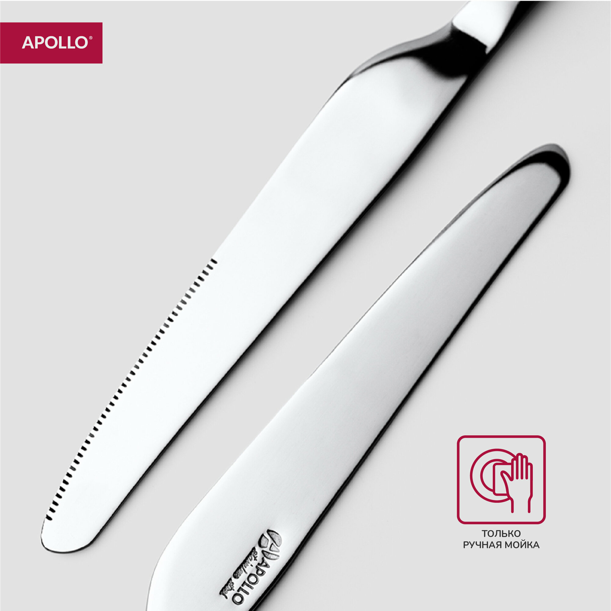 Отлично сбалансированные ручки приборов позволяют приборам удобно ложиться в руку. Приборы Apollo отличают идеальная обработка края и высокое качество полировки.Столовые приборы изготовлены из высококачественной нержавеющей стали марки 18/0:прочные и устойчивые к деформации, легко моются;обладают высокими антикоррозийными свойствами.Состав набора: ложки столовые 6 шт, ложки чайные 6 шт, вилки 6 шт, ножи столовые 6 шт.Длина приборов: нож - 23 см, столовая ложка - 20 см, вилка - 20 см, чайная ложка - 14 см.Можно мыть в посудомоечной машине. Рекомендуется ручная мойка ножей.
