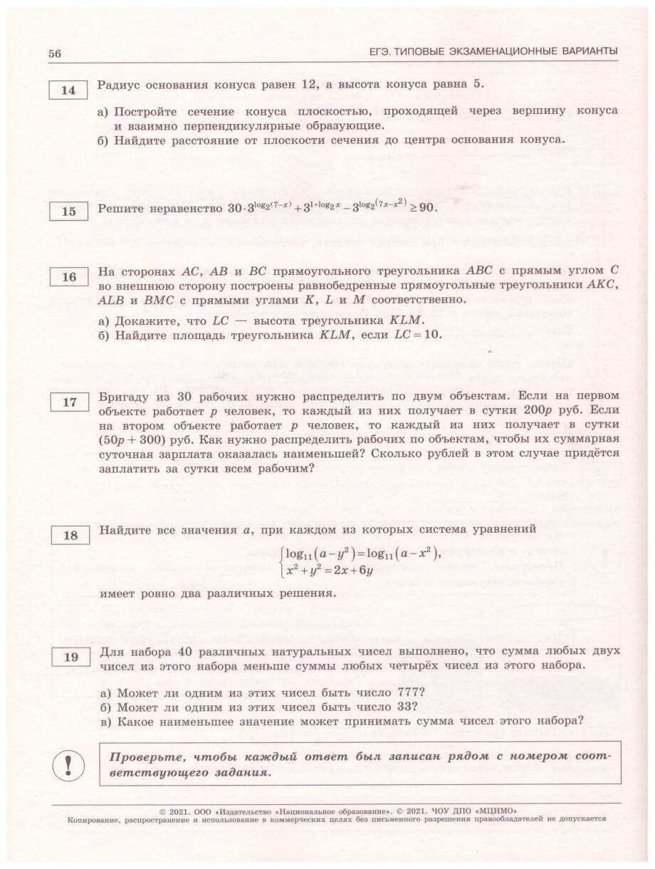 - 10 типовых экзаменационных вариантов, составленных в соответствии с проектом демоверсии КИМ ЕГЭ по математике профильного уровня 2021 года;
