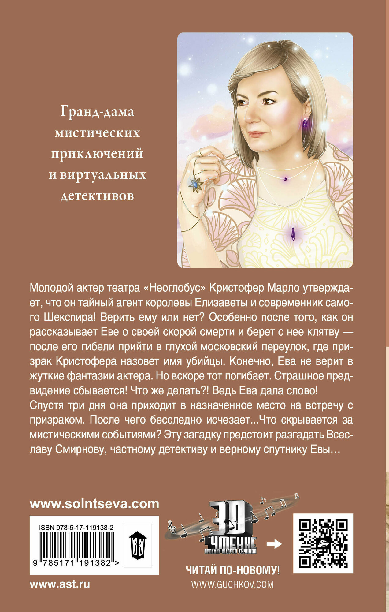 Молодой актер театра «Неоглобус» Кристофер Марло утверждает, что он тайный агент королевы Елизаветы и современник самого Шекспира! Верить ему или нет? Особенно после того, как он рассказывает Еве о своей скорой смерти и берет с нее клятву — после его гибели прийти в глухой московский переулок, где призрак Кристофера назовет имя убийцы. Конечно, Ева не верит в жуткие фантазии актера. Но вскоре тот погибает. Страшное предвидение сбывается! Что же делать? ! Ведь Ева дала слово!Спустя три дня она приходит в назначенное место на встречу с призраком. После чего бесследно исчезает. Что скрывается за мистическими событиями? Эту загадку предстоит разгадать Всеславу Смирнову, частному детективу и верному спутнику Евы.