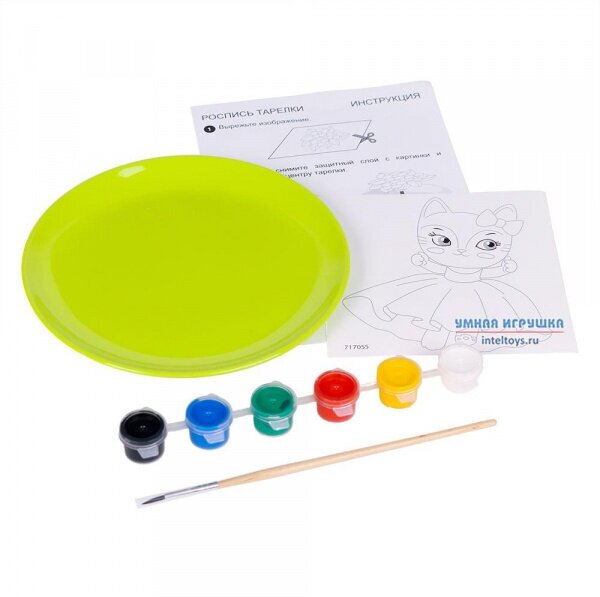 В наборе: пластиковая тарелка, краски, кисть, наклейка-раскраска, инструкция.