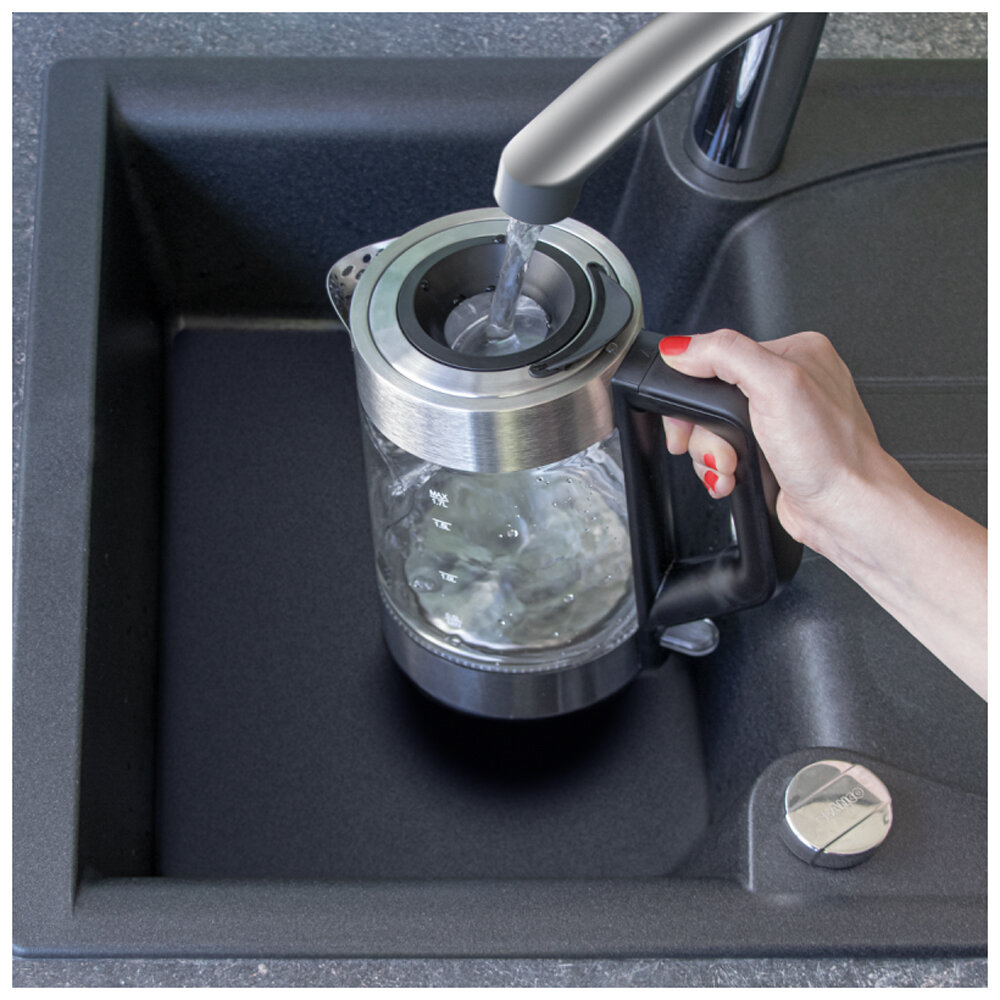 Емкость для воды из термостойкого безопасного стекла. Объём 1,7 литров. Самозакрывающееся отверстие для заполнения в крышке. Разноцветная подсветка воды (50 ° C, 70 ° C, 80 ° C, 90 ° C и 100 ° C).