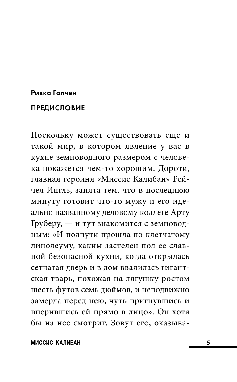"Миссис Калибан" вошла в список 20 лучших произведений второй половины XX века, и вот почему: за сюрреалистическим сюжетом кроется замечательная социальная сатира. Рейчел Инглз углубляется в гендерную политику, формирует взгляд на ментальное здоровье, касается женской раскрепощенности и свободы воли. После прочтения наверняка возникнет много вопросов, захочется перечитать снова, чтобы распознать интертекстуальность.